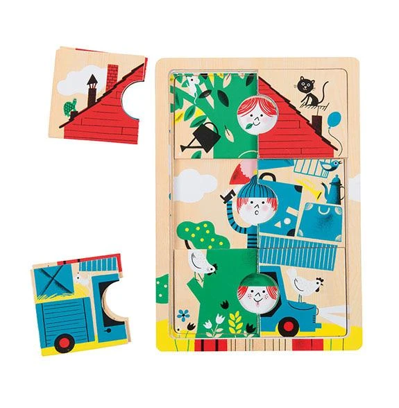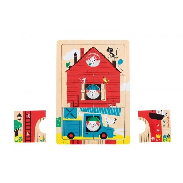 This wooden puzzle consists of 18 pieces which are superimposed on 3 levels. Each level represents in a bright colour the Bambins (kids): a red house then a blue van then a green tree, all beautifully illustrated with a multitude of details. A funny game to entertain your child while stimulating her/his fine motor skills and concentration. Dimensions: 21×30 cm. Materials: MDF. Suitable from 2 years.
