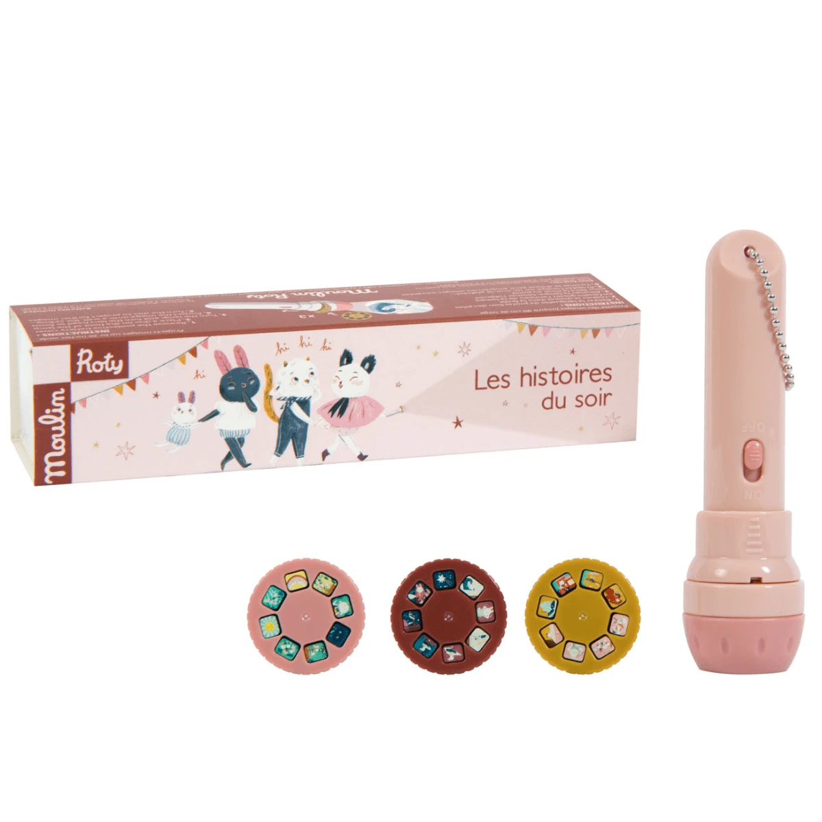 Pink lantern with 3 discs of images of the protagonists of the After the Rain collection by Moulin Roty. You can make up your own stories while projecting the images on the ceiling or wall. Ideal to explain the good night story to your little one. The stories do not have text, they are made up images. Material : Plastic.