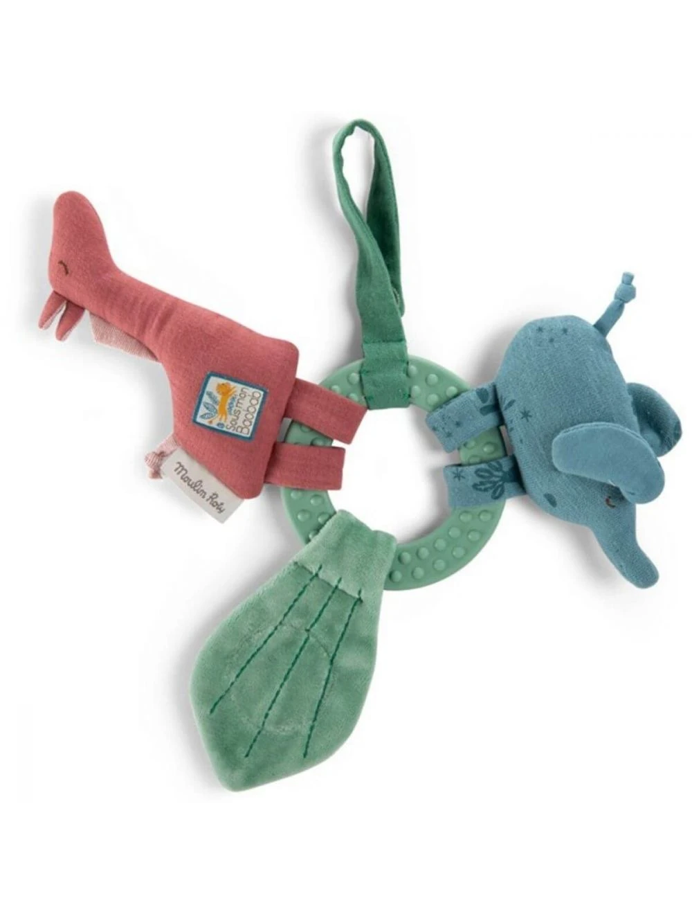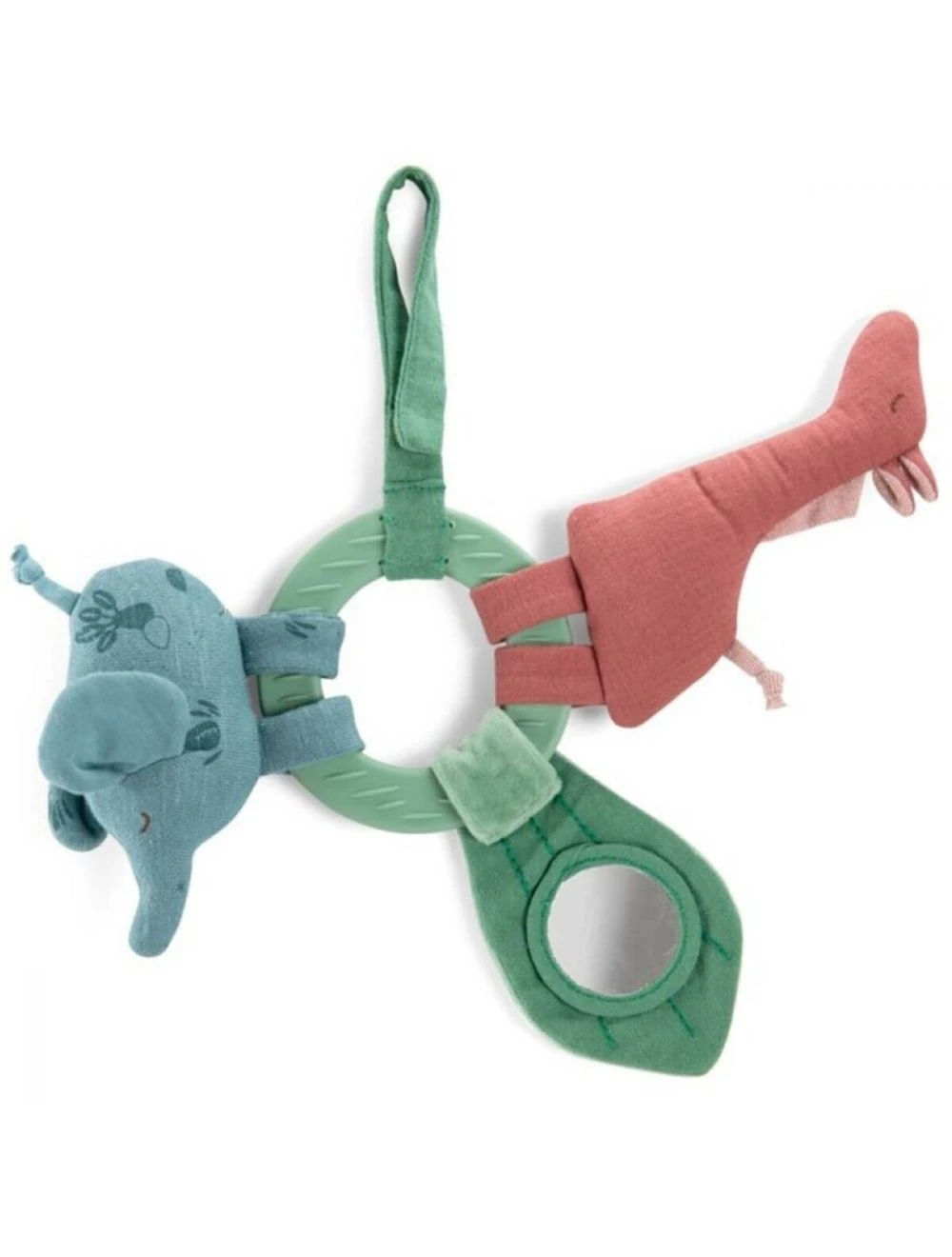 Este aro de actividades tiene una gran variedad de colores y texturas para estimular sensorialmente a tu bebé. Las orejas del elefante crujen y hacen ruido al tocarlas y la jirafa tiene un suave sonajero en su interior; además la hoja lleva un espejo para que pueda ver su cara y empezar a reconocerse. El aro es de silicona de grado alimentario para calmar el proceso de dentición y lleva un lazo con velcro para que puedas colgarlo fácilmente en cualquier lugar.
