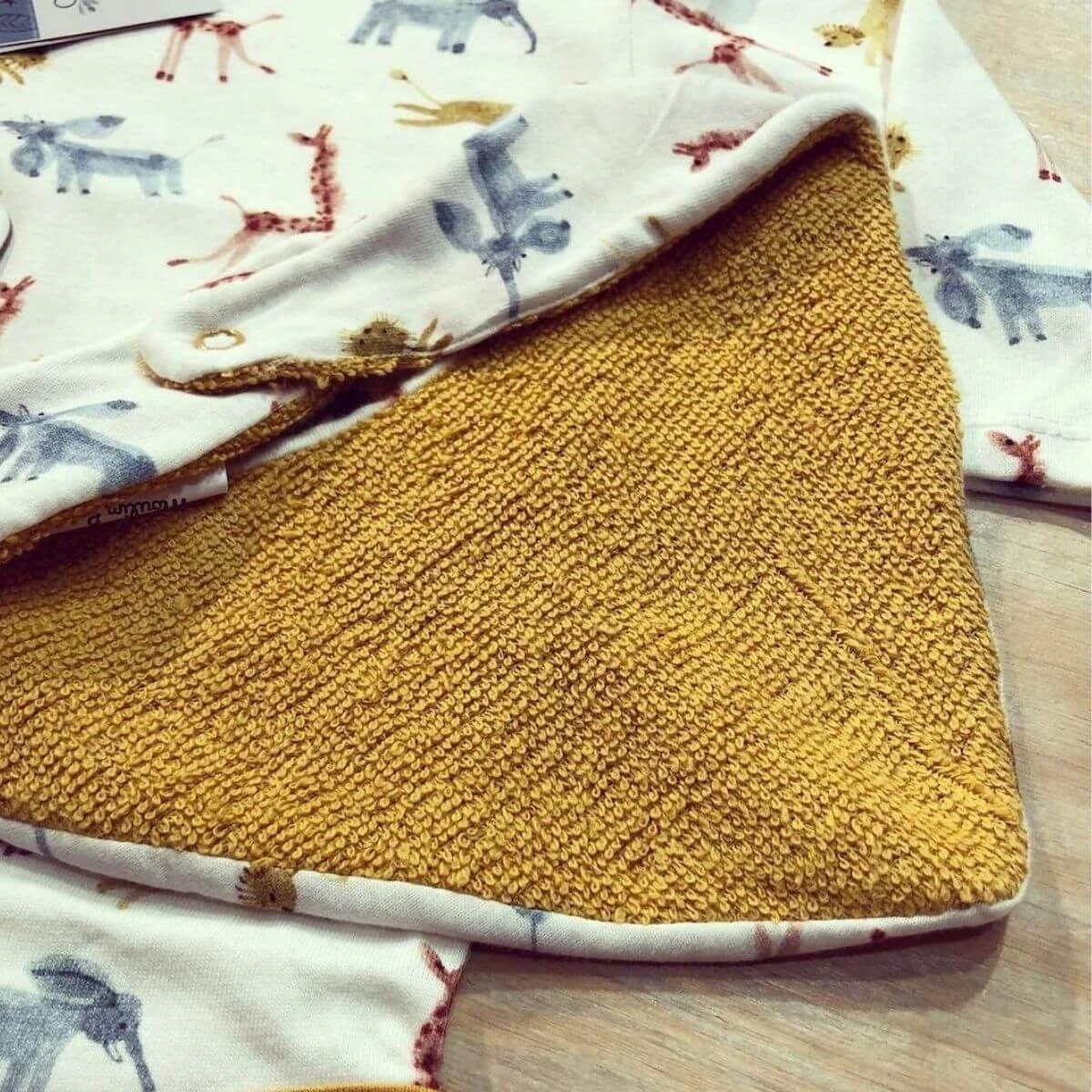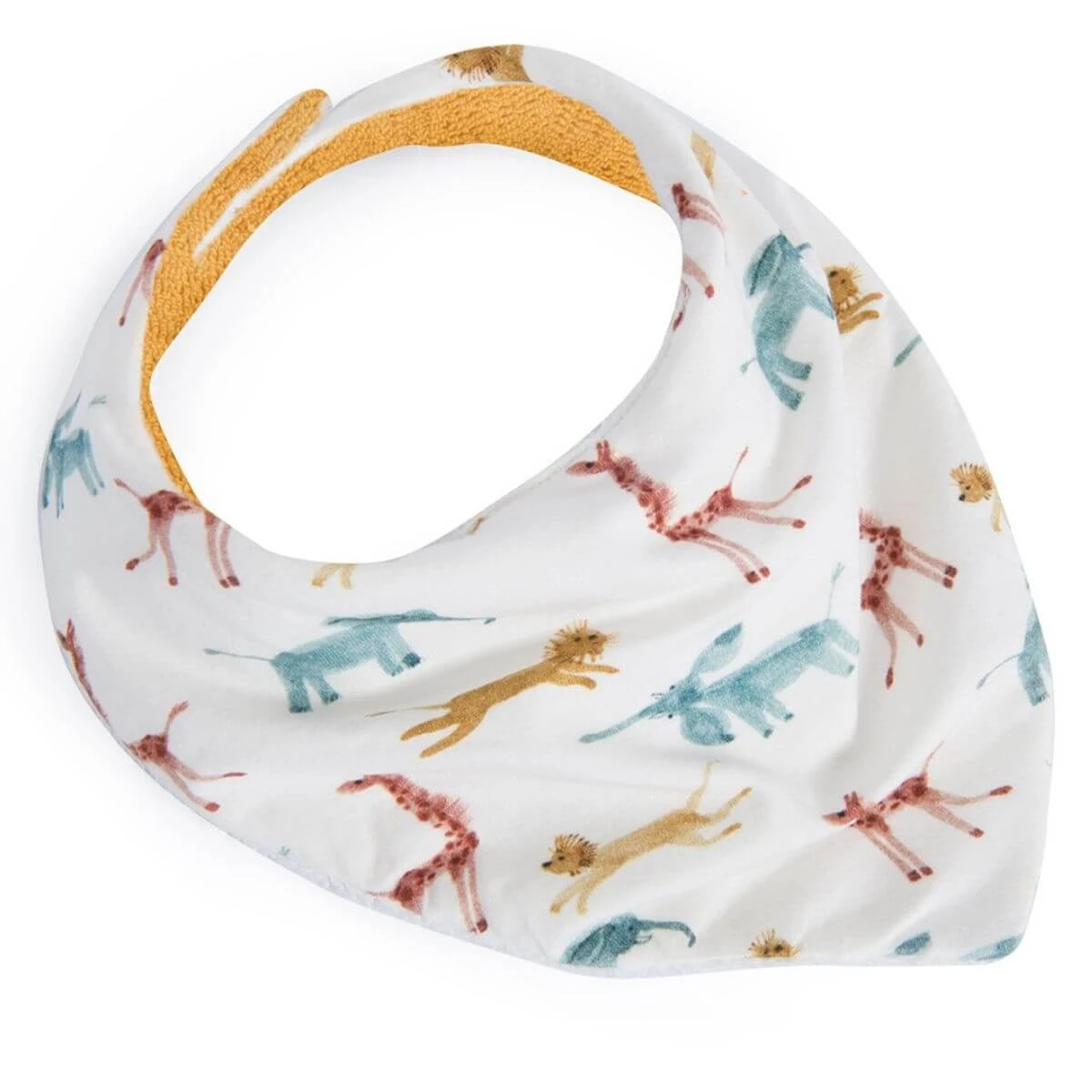 Este babero es perfecto para proteger la ropa de tu bebé de las babitas y la leche durante el día. Hecho de algodón 100%, se cierra a presión en la parte trasera. El interior es amarillo y en el exterior tiene un bonito estampado de animales de la selva. A partir de 0 meses.