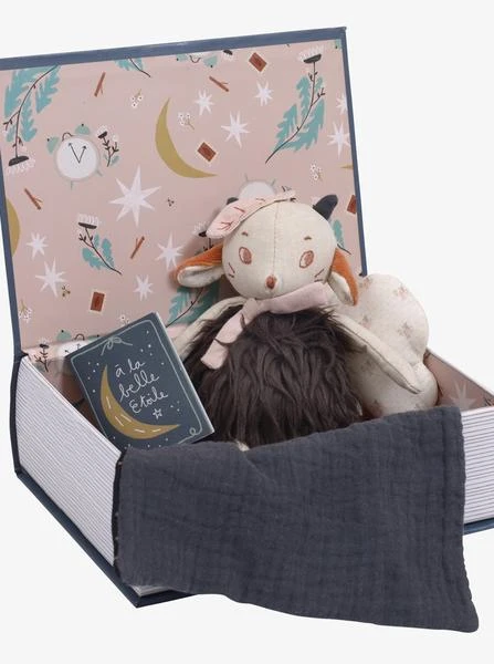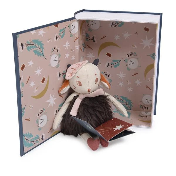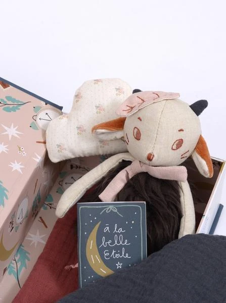 Inside a box illustrated by Lucille Michieli, Réglisse the sheep made of fur and chambray fabric is snuggled underneath his spotty blanket, between his towelling mattress and cloud pillow. He holds a tiny book for telling enchanting stories. Dimensions: 20cm Material: Cotton, Polyester, Elastane, Linen Care: Toys inside are machine washable at 30°C on wool cycle. No tumble dry. Suitable for children from age 2 years +.