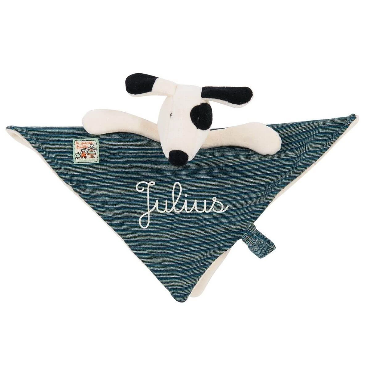 A soft doudou of the puppy Julius from the Moulin Roty Big Family collection. Ideal to calm and sleep your baby in his first months of life. He will become his inseparable friend.