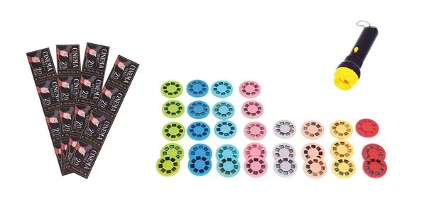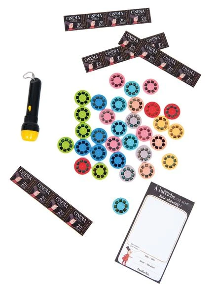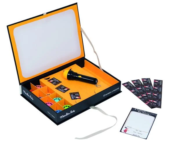 Moulin Roty es una marca francesa que se inició en 1972 con 20 amigos que aspiraban a compaginar vida y trabajo; decidieron comprar un antiguo molino en ruinas, remodelarlo instalarse allí con sus familiar e iniciarse en la aventura de crear juguetes artesanos. Con más de 40 años de experiencia siguen fabricando juguetes con aire antiguo pero adaptados a nuestra era. Trabajan con materiales y diseños de gran calidad seleccionados en Europa. Una versión de Luxe de la caja del cine con 32 discos ! Si si 32 !! Una caja con todo lo necesario para jugar a los cines ! Entradas para los espectadores, una linterna proyector con 32 discos diferentes de diferentes temáticas para desarrollar la imaginación y explicar las películas, los carteles de las películas y la misma tapa hace de pantalla para el proyector. A partir de 3 años. 25 x 18 cm.