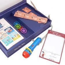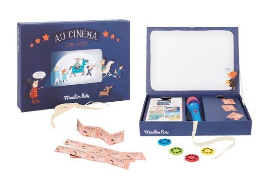 Moulin Roty es una marca francesa que se inició en 1972 con 20 amigos que aspiraban a compaginar vida y trabajo; decidieron comprar un antiguo molino en ruinas, remodelarlo instalarse allí con sus familiar e iniciarse en la aventura de crear juguetes artesanos. Con más de 40 años de experiencia siguen fabricando juguetes con aire antiguo pero adaptados a nuestra era. Trabajan con materiales y diseños de gran calidad seleccionados en Europa. Una caja con todo lo necesario para jugar a los cines ! Entradas para los espectadores, una linterna proyector con 5 discos diferentes de diferentes temáticas para desarrollar la imaginación y explicar las películas, los carteles de las películas y la misma tapa hace de pantalla para el proyector. A partir de 3 años. 25 x 18 cm.