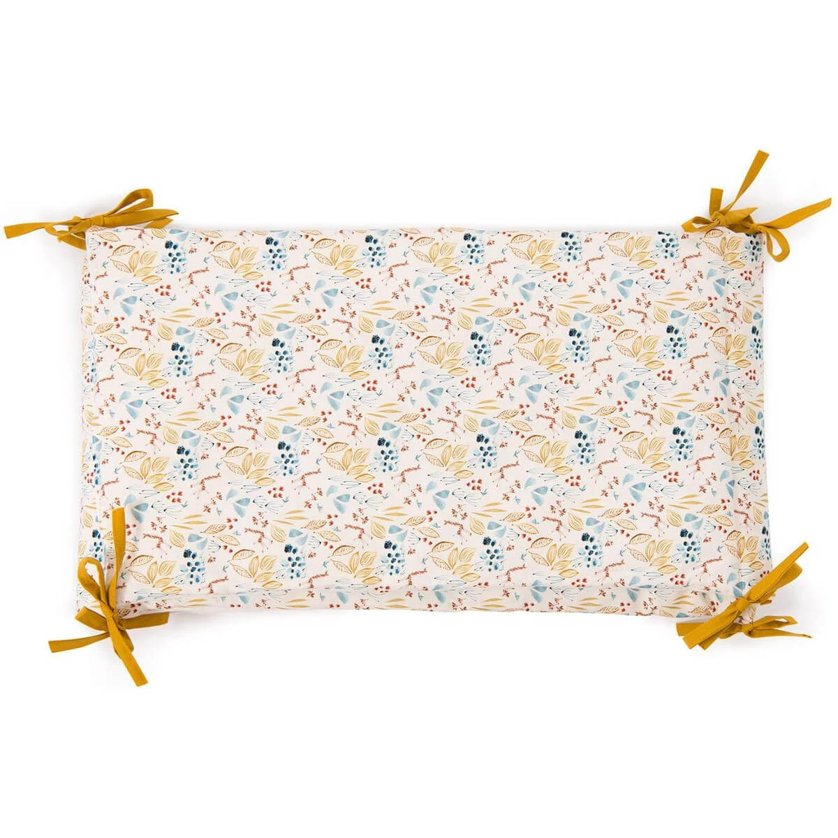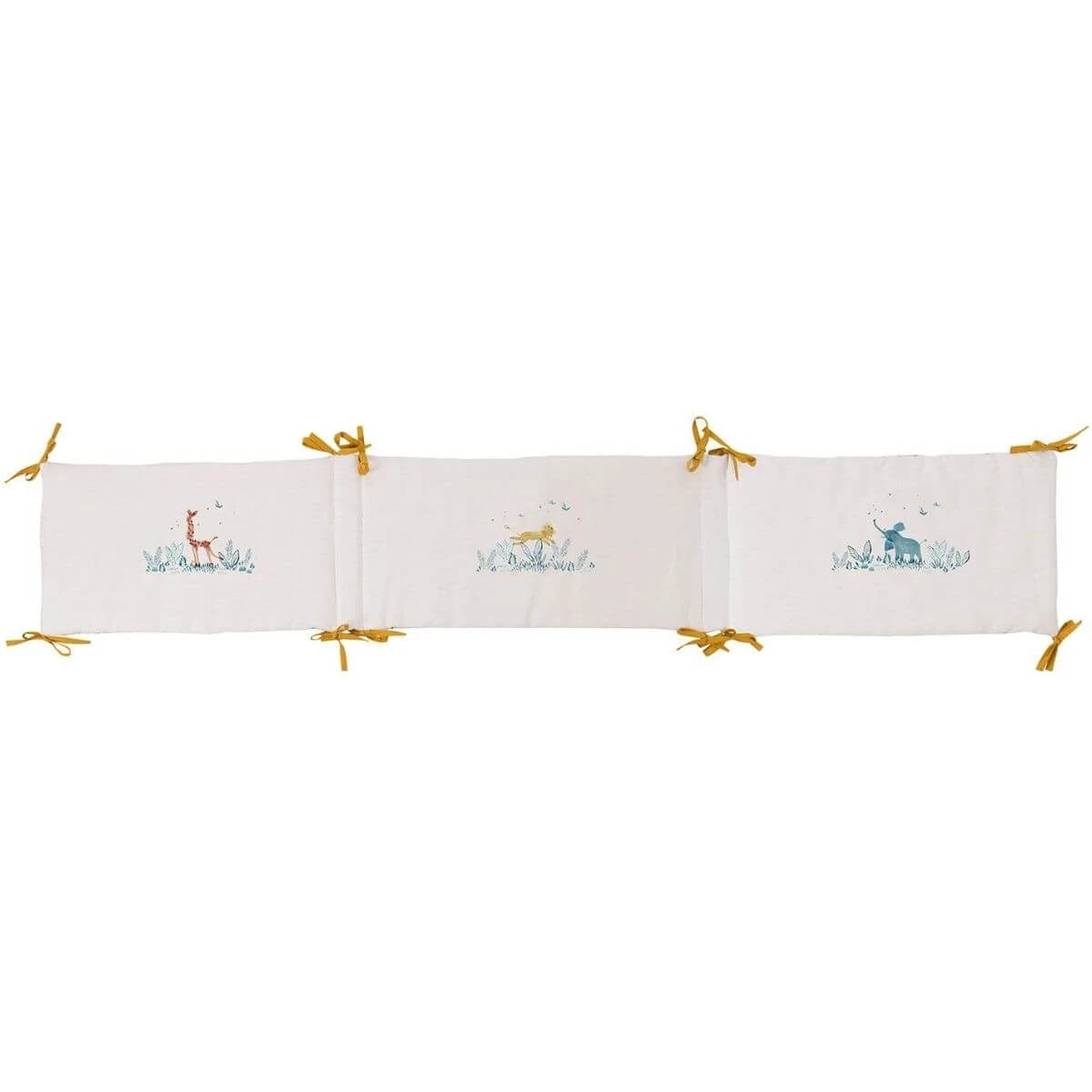Soft cream-colored crib bumper with giraffe print on one side and with the protagonists of the Moulin Roty Baobab collection on the other side. To protect your baby while he sleeps and moves around in the crib. It can be used in 60 or 70 cm cradles and is held by adjustable ties at different heights.