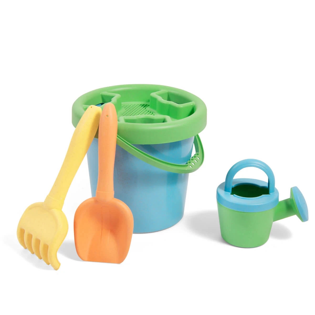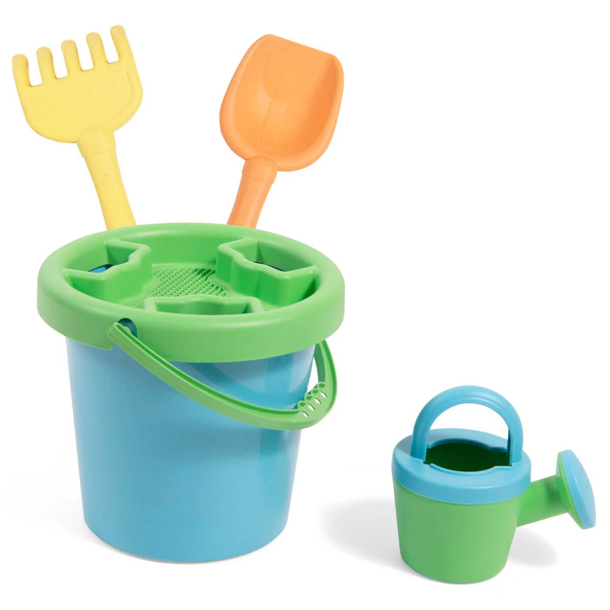 Cubo de playa y accesorios de vivos colores para disfrutar jugando en la arena o en la tierra del parque o jardín. Incluye un cubo con tapa, una pala, un rastrillo y una regadera. Fabricado en plástico de alta calidad y resistencia.