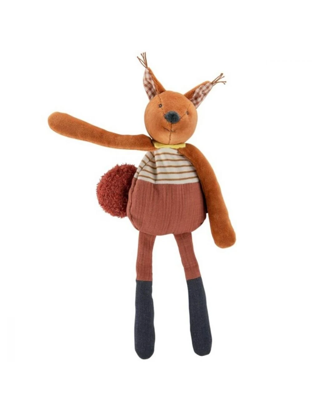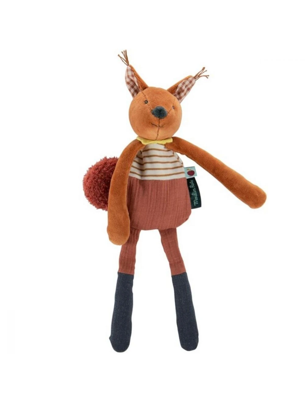 La ardilla de la colección Manzana del Bosque de Moulin Roty es un sonajero suave de terciopelo y algodón certificado OEKO-TEX, de color avellana con una dulce y amable expresión en su rostro. En la cabeza tiene un cascabel que tintinea suavemente y tiene semillas en el cuerpo. Gracias a sus patas largas y estilizadas, las manitas de tu bebé podrán agarrarlo y abrazarlo fácilmente, por lo que también puede usarlo como doudou a la hora de dormir.