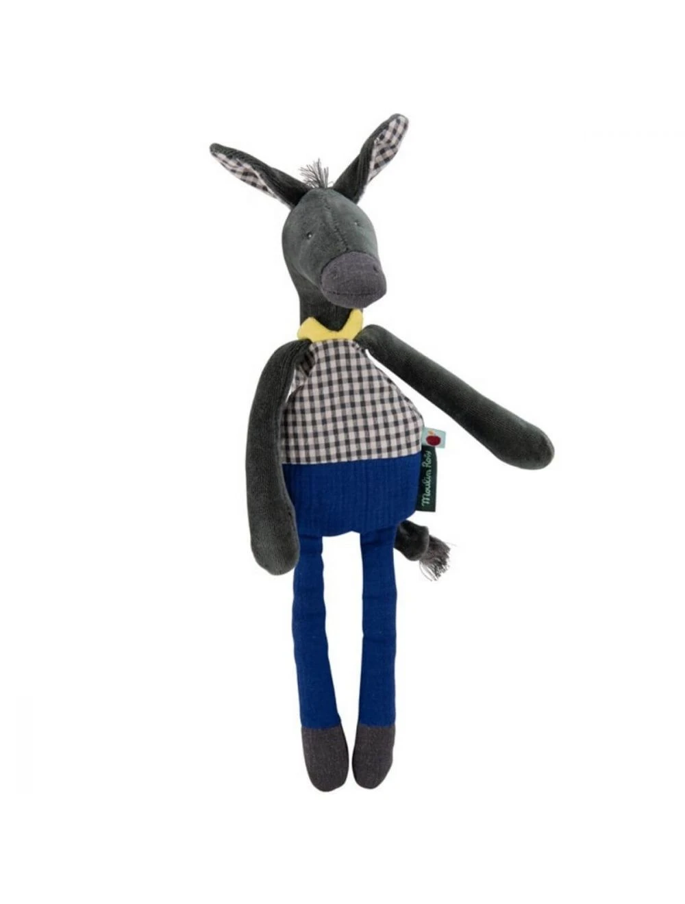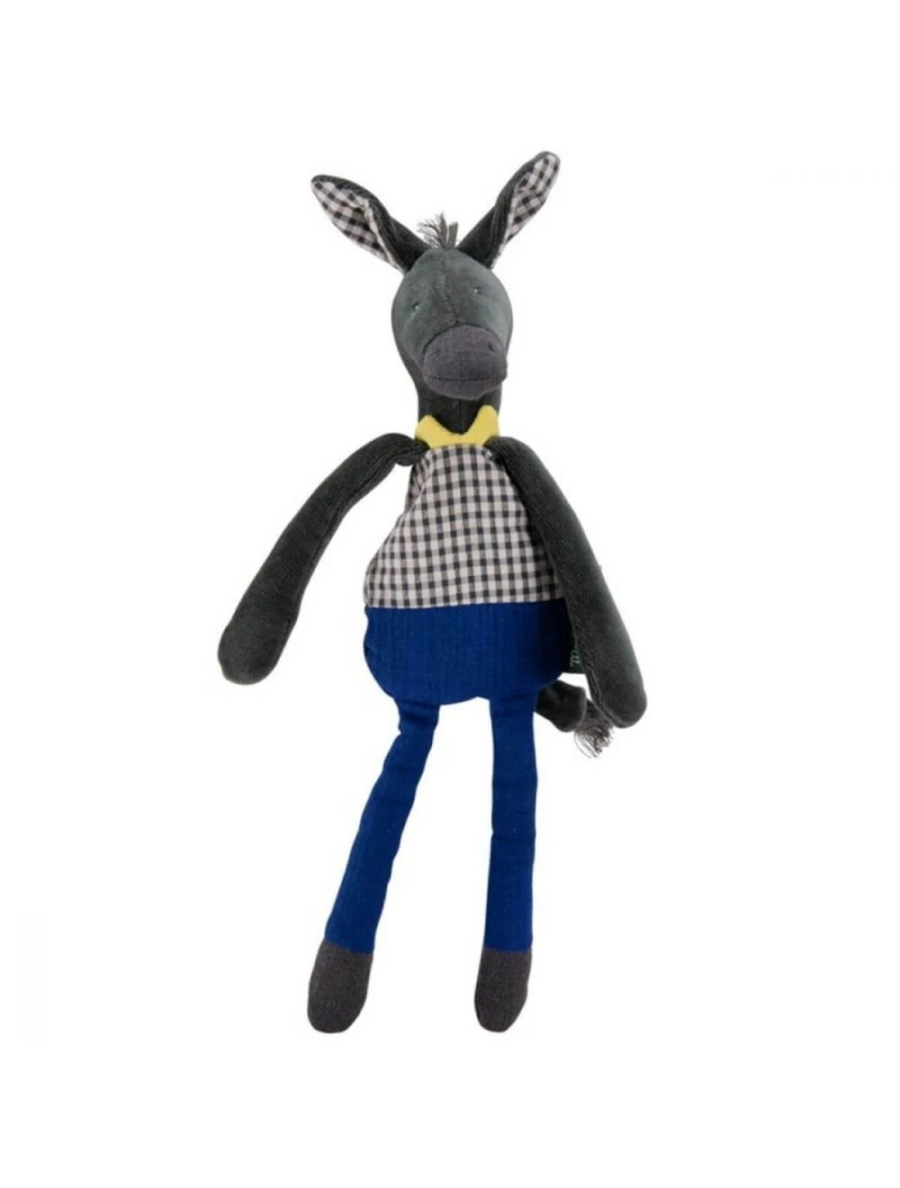 El asno de la colección Manzana del Bosque de Moulin Roty es un sonajero suave de terciopelo y algodón certificado OEKO-TEX, de color arándano, gris oscuro y amarillo con una dulce y amable expresión en su rostro. En la cabeza tiene un cascabel que tintinea suavemente y tiene semillas en el cuerpo. Gracias a sus patas largas y estilizadas, las manitas de tu bebé podrán agarrarlo y abrazarlo fácilmente, por lo que también puede usarlo como doudou a la hora de dormir.