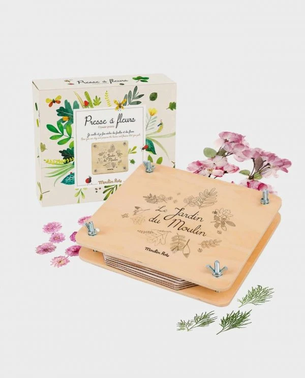 This flower press consists of 2 wooden boards and screws so that the boards can be more or less adjusted according to the needs.