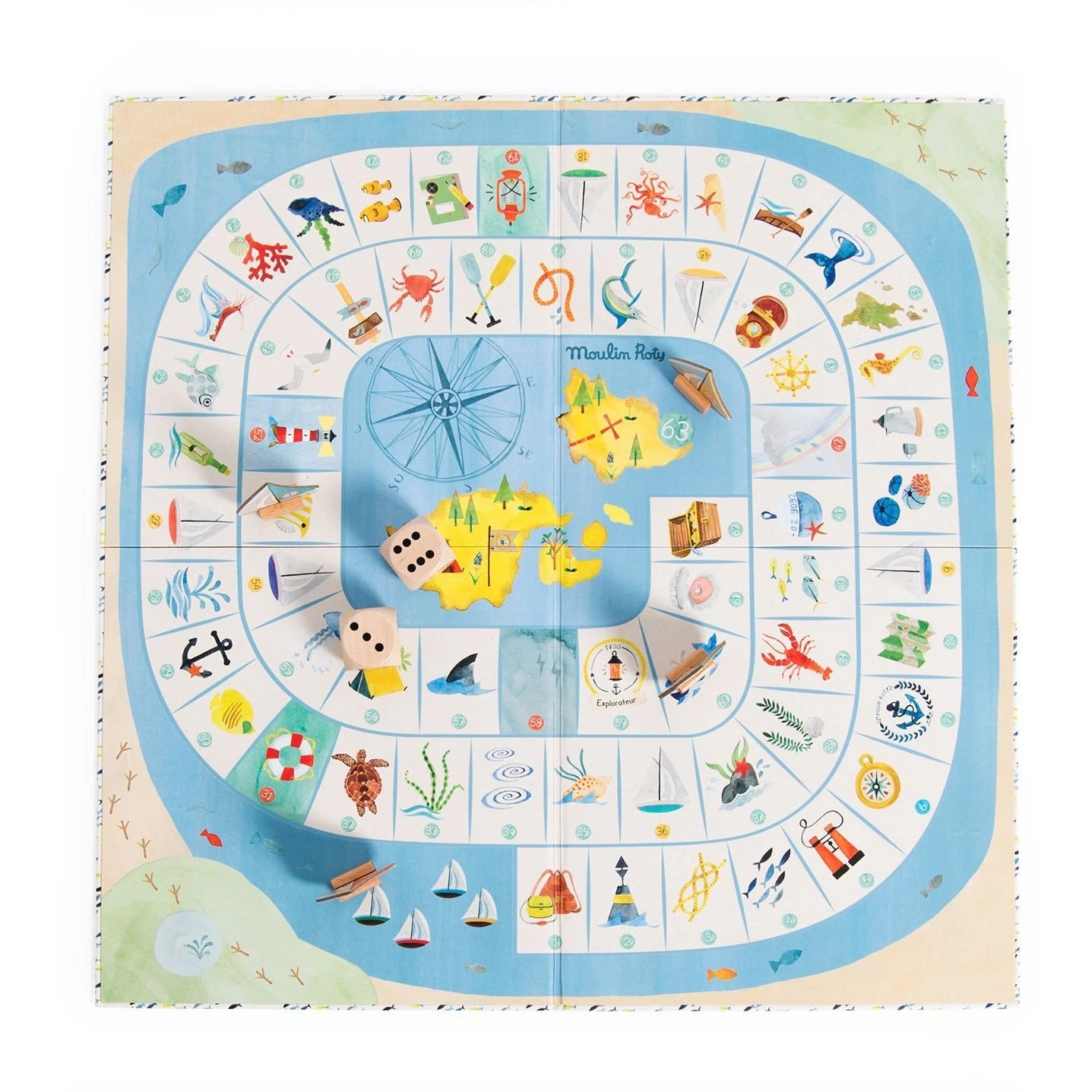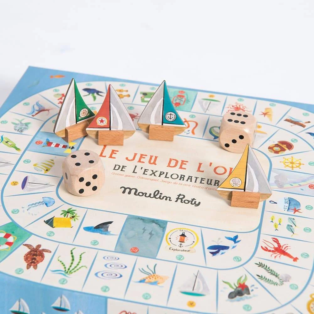 Il Gioco dell’Oca rivisitato sul tema dell’esploratore da Moulin Roty. Immergiti in un mondo marino ricco di dettagli grazie a questo gioco da tavolo classico e senza tempo. Consiste in un tabellone di gioco con 63 scatole illustrate ad acquerello, 2 dadi grandi e 4 pedine di barche. Il tuo bambino si divertirà a tirare i dadi e ad avanzare con la sua barca per andare a prendere prima il favoloso tesoro! Durante il suo viaggio, incontrerà divertenti animali marini e affronterà coraggiosamente i pericoli che incombono all’orizzonte. Adatto ai bambini a partire dall’età di 5 anni, questo gioco da tavolo insegna ai bambini come seguire e rispettare le regole ma soprattutto il tuo bambino condividerà un buon momento con la famiglia e imparerà a contare divertendosi. 2-4 giocatori Dai 5 anni Dimensioni: 30 x 5 x 25,5 cm. Materiali: cartone, legno.
