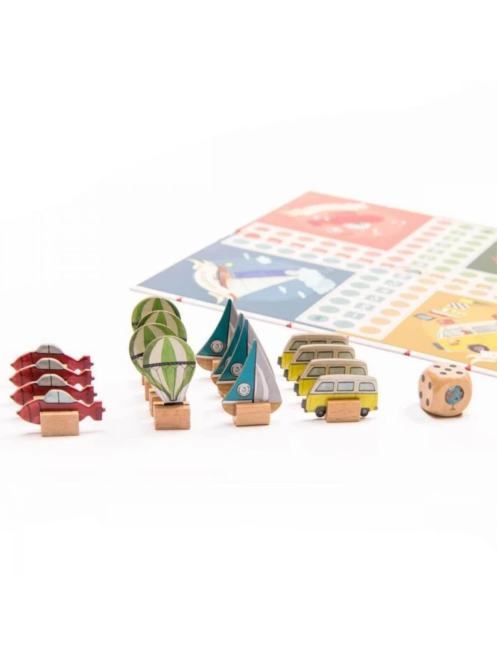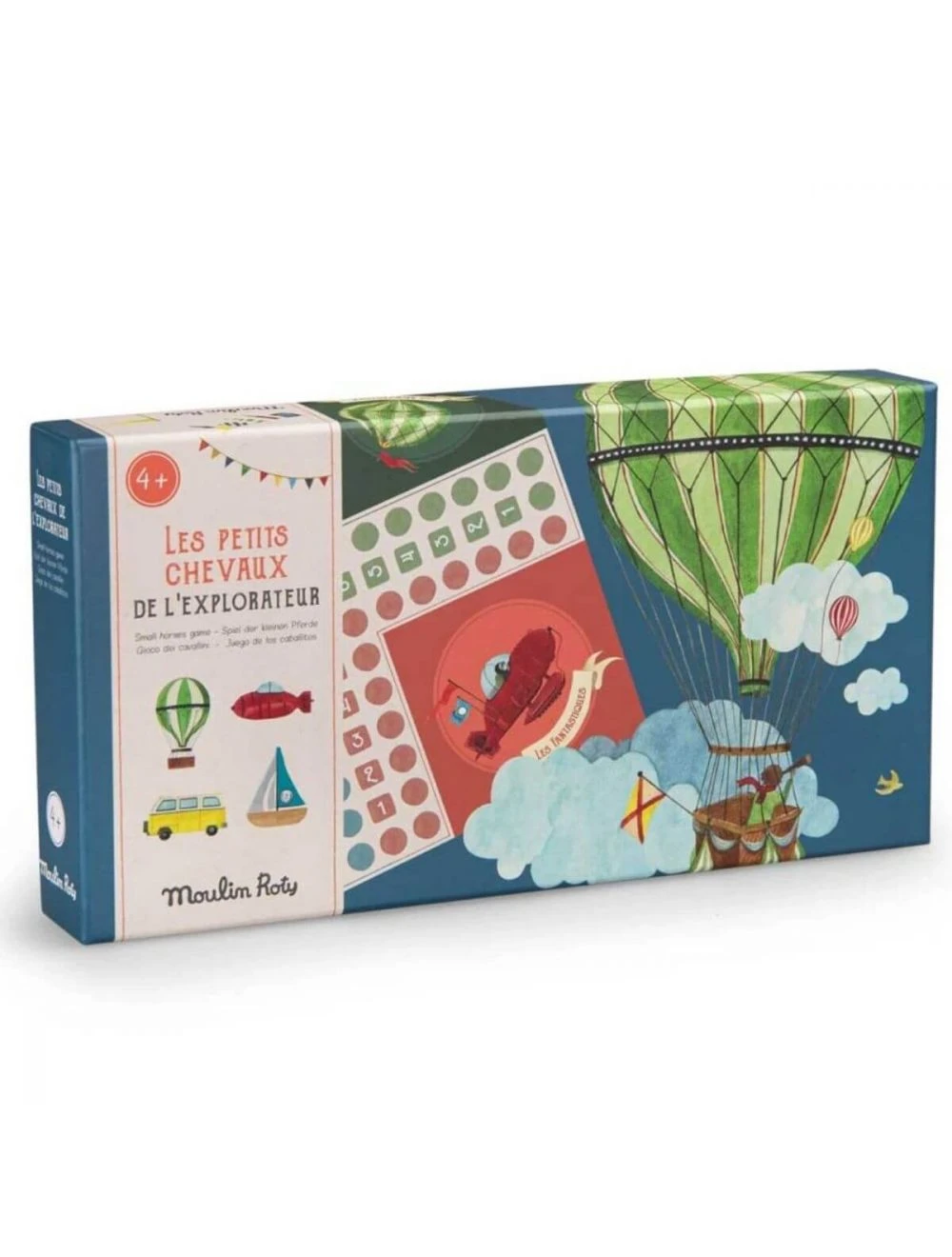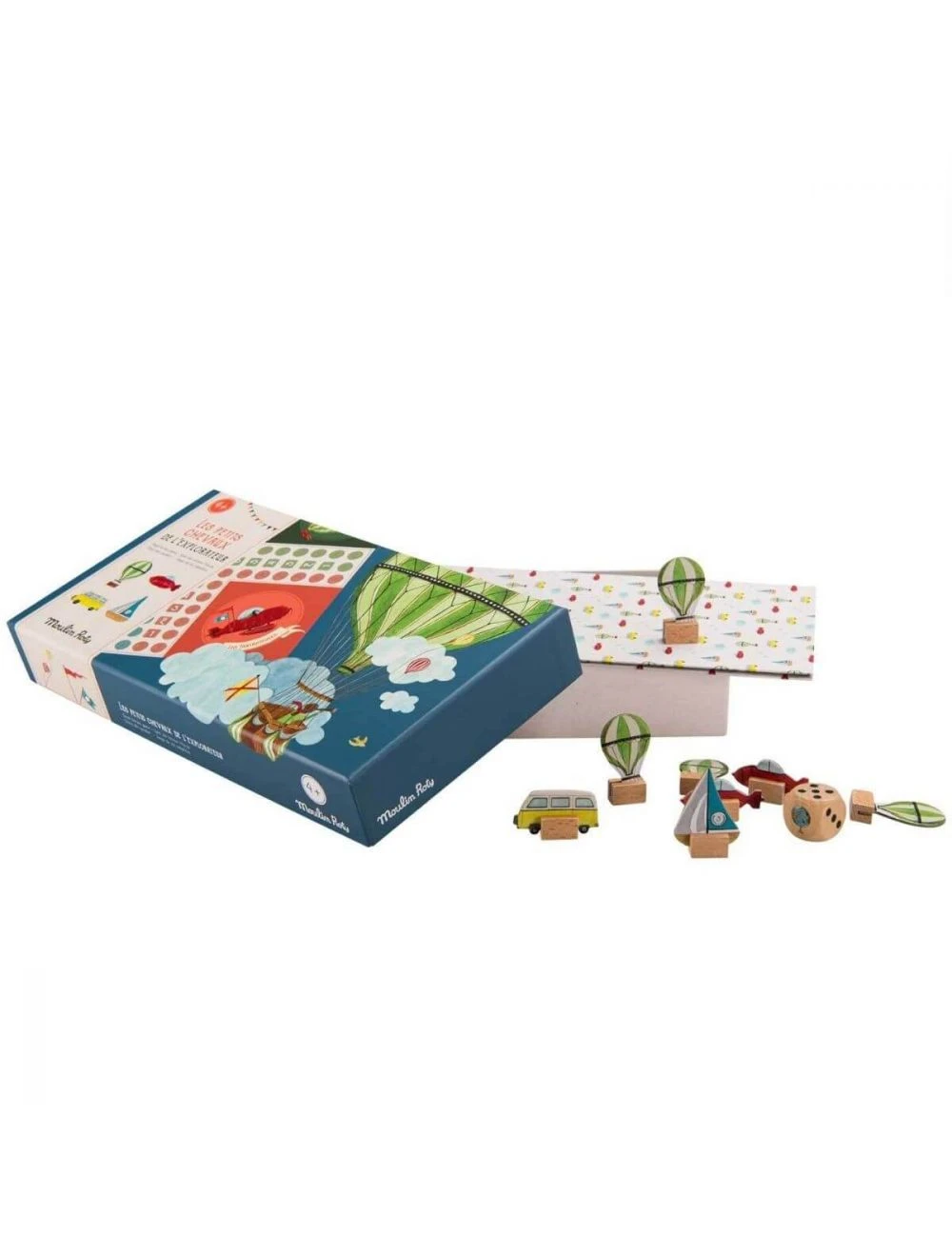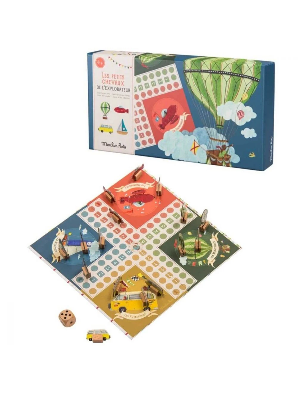 El clásico juego del parchís tematizado como un gran viaje alrededor del mundo: barcos, aviones, furgonetas y globos de aire; ¡escoge tu equipo! Un juego atemporal para disfrutar en familia y consolidar conocimientos relacionados con los colores y los números, con un precioso diseño vintage de la colección Explorador de Moulin Roty.