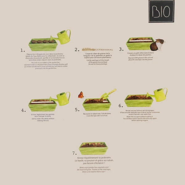 Este kit de jardinera de albahaca es perfecto para que los peques se conviertan en jardineros y aprendan a cuidar de su propio huerto. El kit contiene: cinta de semillas de albahaca, una jardinera de madera de color verde y cuatro discos de fibra de coco para crear el sustrato. ¡Todo lo necesario para poder empezar a crear tu propio mini huerto! Moulin Roty es una marca francesa que se inició en 1972 con 20 amigos que aspiraban a compaginar vida y trabajo; decidieron comprar un antiguo molino en ruinas, remodelarlo instalarse allí con sus familiar e iniciarse en la aventura de crear juguetes artesanos. Con más de 40 años de experiencia siguen fabricando juguetes con aire antiguo pero adaptados a nuestra era. Trabajan con materiales y diseños de gran calidad seleccionados en Europa. Edad: A partir de 3 años Dimensiones : 27 x 12 x 9,50 cm
