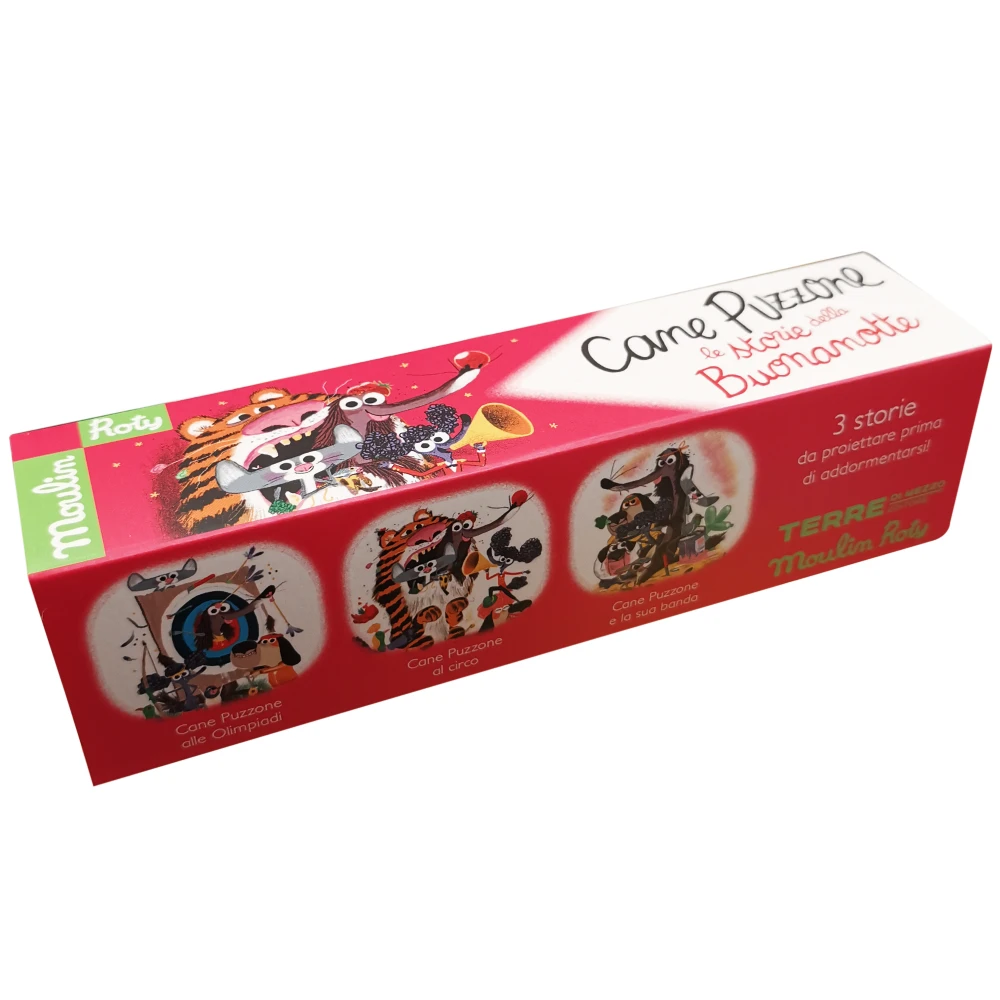 La lampada proietta favole di Moulin Roty è un gioco originale e unico nel suo genere! Proietta 24 immagini grazie alle sue 3 ghiere contenenti ognuna 8 immagini a colori per narrare appassionanti storie ai vostri bimbi. Inclusi nella confezione ci sono tre dischi per tre storie originali e appassionanti. La lampada proietta favole è un rito simpatico da fare prima di addormentarsi. Facile da usare, inserisci il disco nella fenditura, accendi la torcia, metti a fuoco e proietta l’immagine sul muro, il soffitto o sul pavimento, poi ruota il disco per proiettare le immagini seguenti della storia. La torcia proietta le immagini fino a 90 cm di larghezza. Per scorrere le immagini, basta girare il disco con un dito e la storia prende vita. Questo gioco senza tempo stimola l’immaginazione e i sensi del bambino. Trasporterà il tuo bambino in un universo poetico tramite illustrazioni colorate. Divertiti a inventare un mondo di favole insieme al tuo bambino. Ideale anche come regalo per un compleanno. Può essere usato anche come semplice torcia. Funziona con 3 batterie a bottone (1,5V AG13/LR44) – INCLUSE Immagini fino a 1 metro di grandezza. È possibile regolare la messa a fuoco ruotando la testa della torcia.
