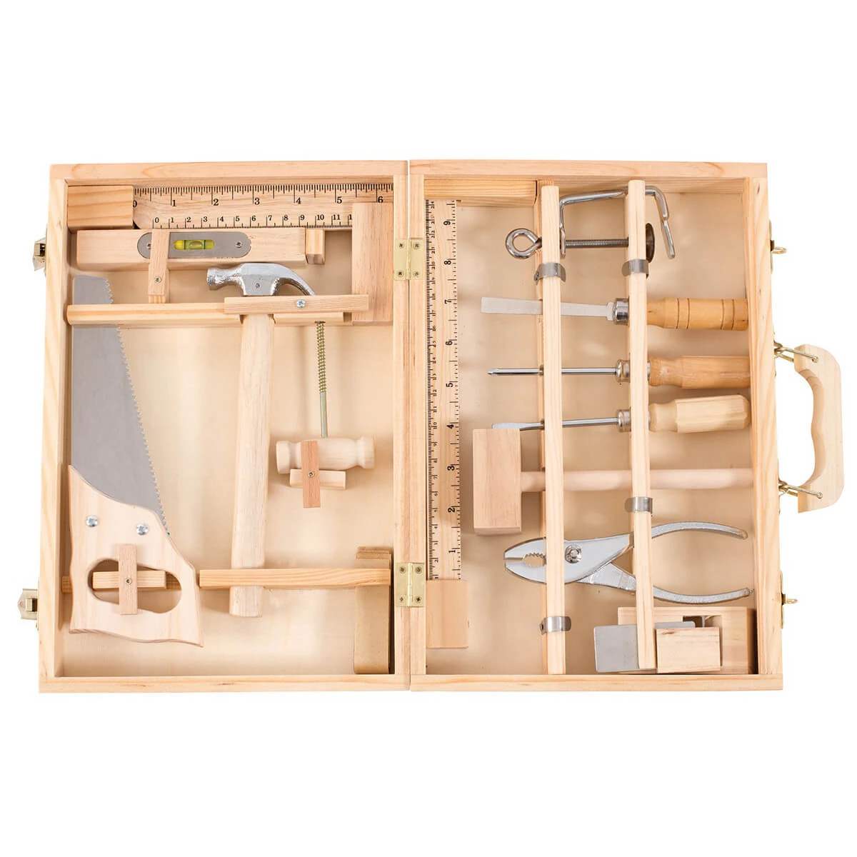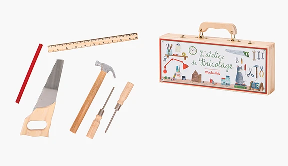 A real toolbox for your little one to play at being a carpenter and help you at home. Made of wood and with a retro style, it contains 14 tools: saw, hammer, ruler, pencil, pliers, screwdriver, etc. Ideal for symbolic play and to develop fine motor skills.