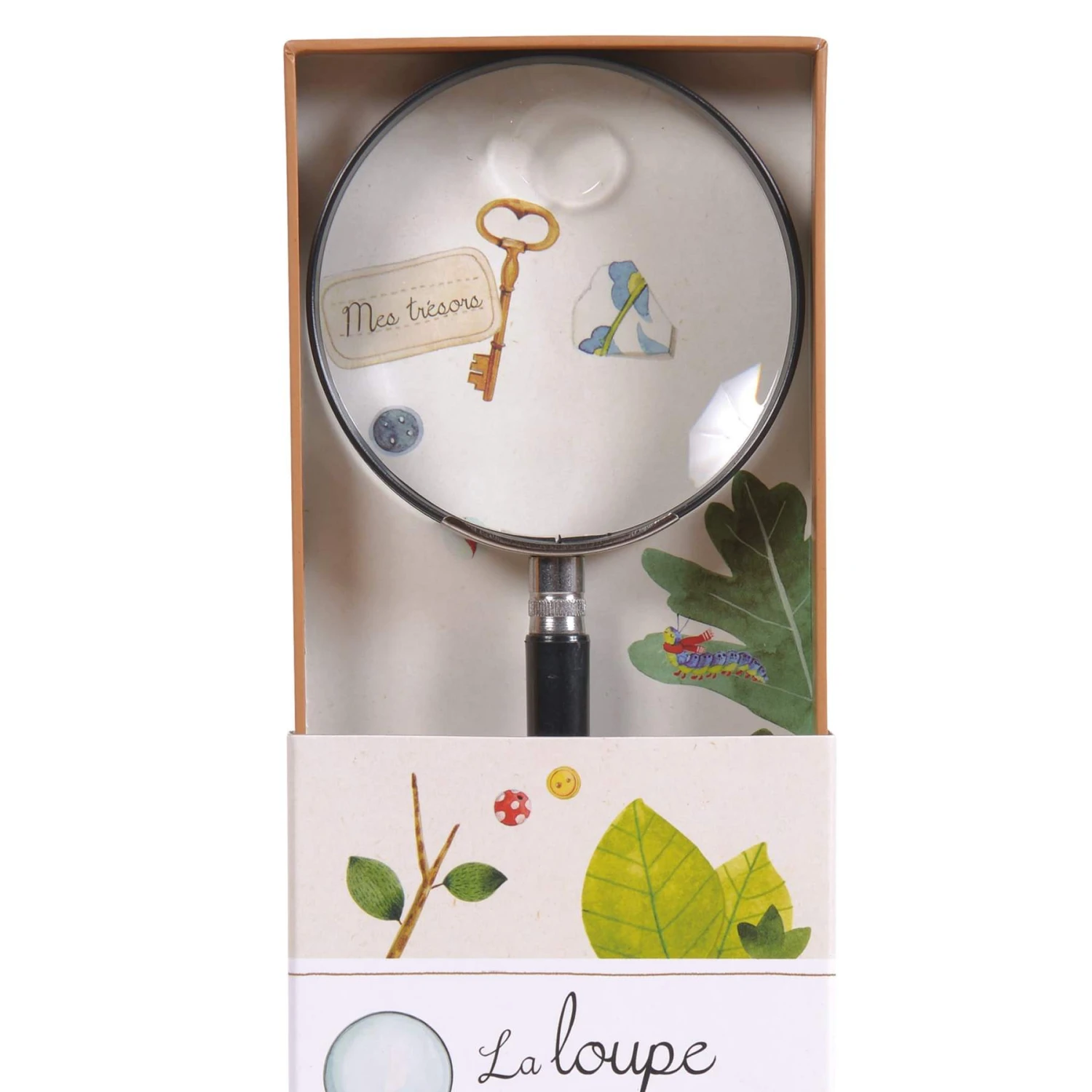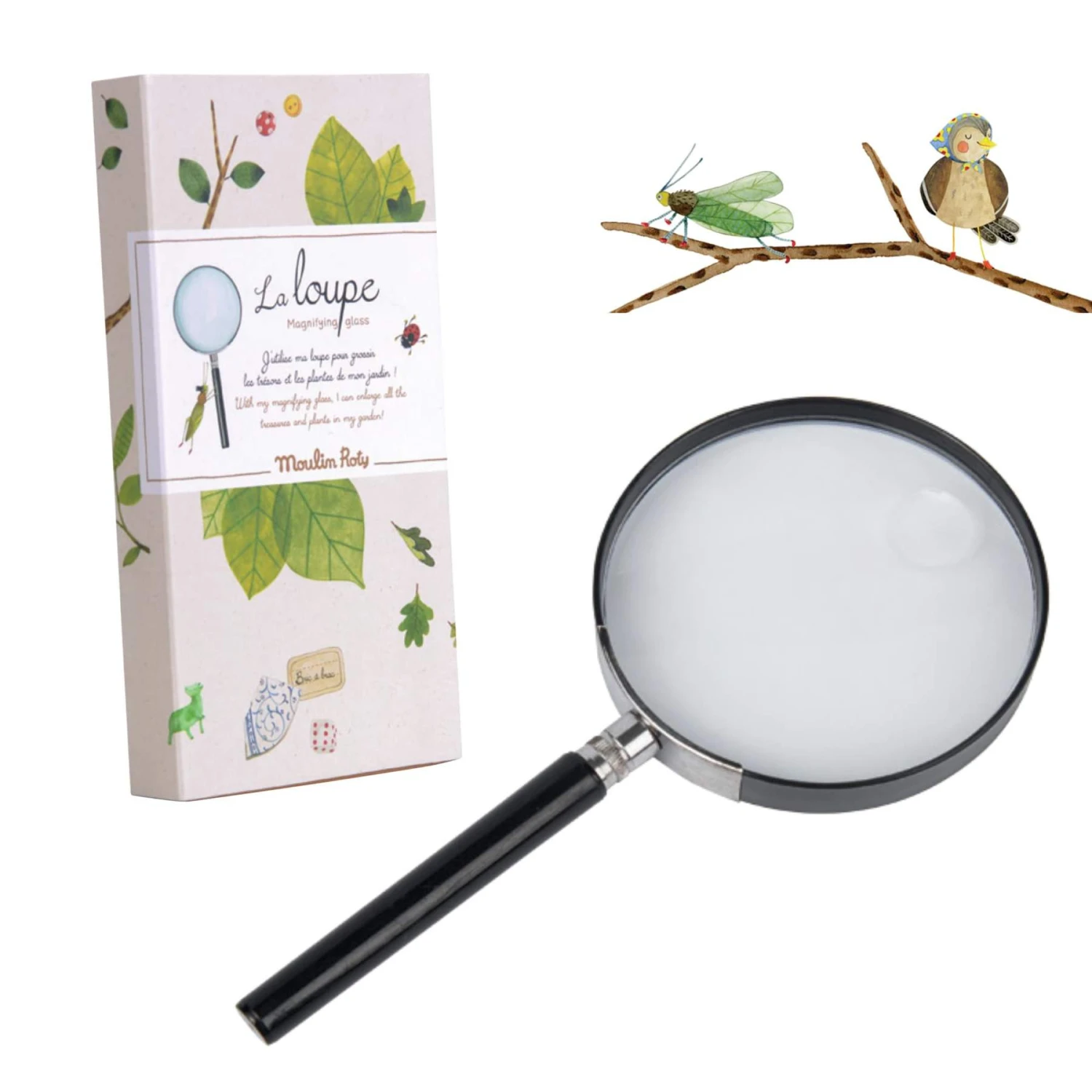Questa gigantesca lente d’ingrandimento permetterà al tuo bambino di osservare da vicino insetti e piante. Questo strumento deve essere messo nelle mani di tutti gli esploratori e botanici in erba. Perfetto per sviluppare la loro curiosità. Dimensioni: 22,5 x 11,5 x 2,5 cm. Materiali: plastica, metallo, vetro. Età: Da 3-4 anni.