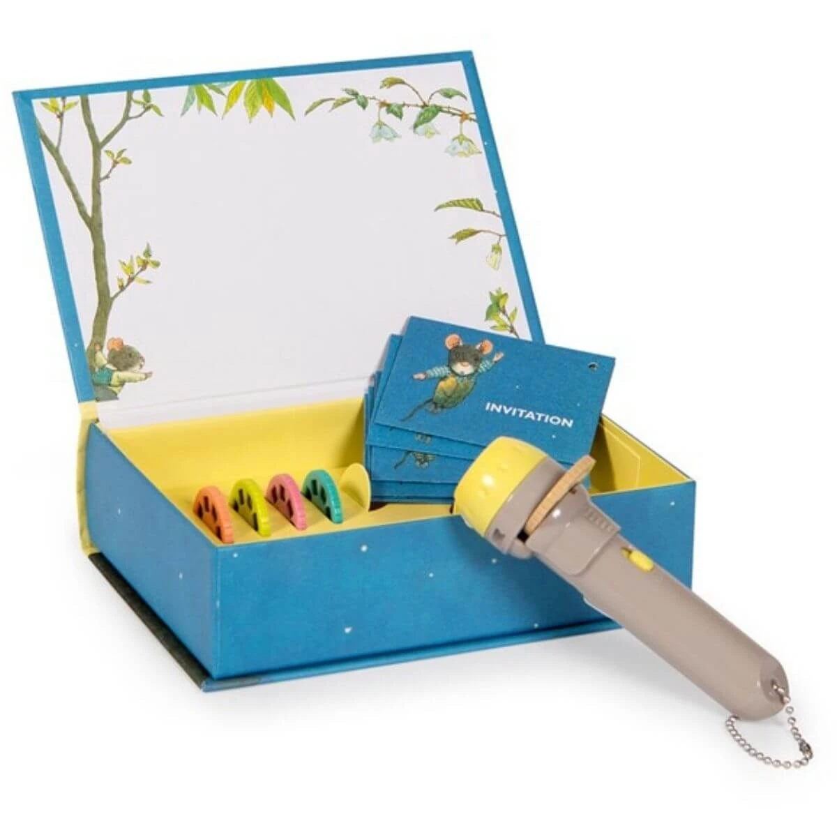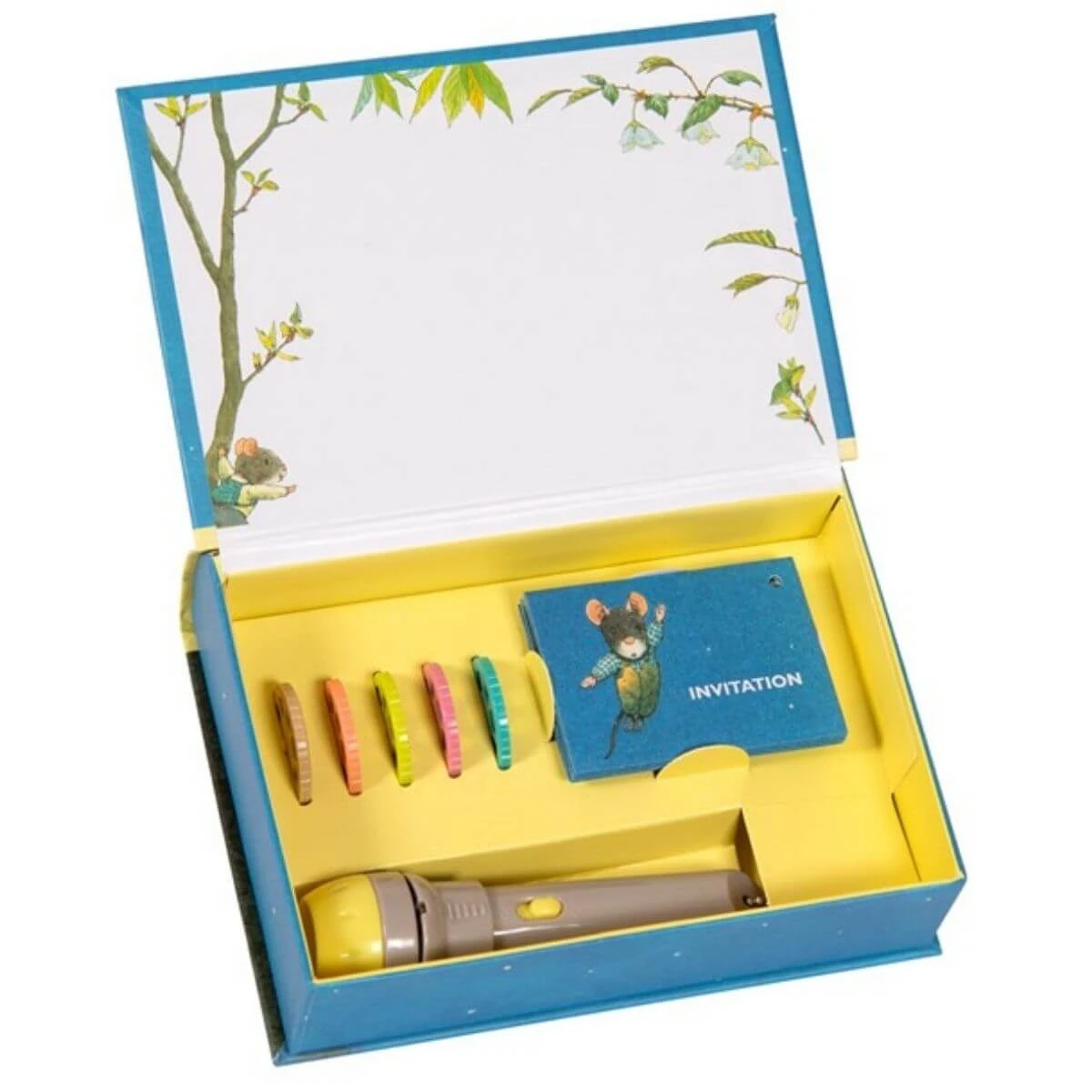 Proyecta los discos de imágenes contra la pared o contra la solapa del libro y crea momentos mágicos inventando historias antes de ir a dormir. El libro incluye la linterna y 5 discos con distintas imágenes.