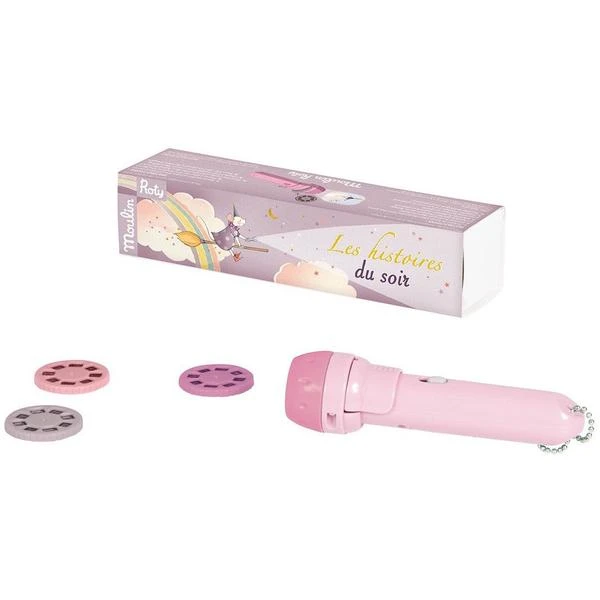 Un linterna proyector con tres discos con diferentes historias de ratoncitas de aprendices de magas. Cada disco contiene 8 imágenes. 16 x 4 x 4 cm. Viene con 3 pilas LR 44. Moulin Roty es una marca francesa que se inició en 1972 con 20 amigos que aspiraban a compaginar vida y trabajo; decidieron comprar un antiguo molino en ruinas, remodelarlo instalarse allí con sus familiar e iniciarse en la aventura de crear juguetes artesanos. Con más de 40 años de experiencia siguen fabricando juguetes con aire antiguo pero adaptados a nuestra era. Trabajan con materiales y diseños de gran calidad seleccionados en Europa.