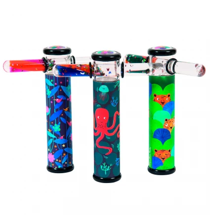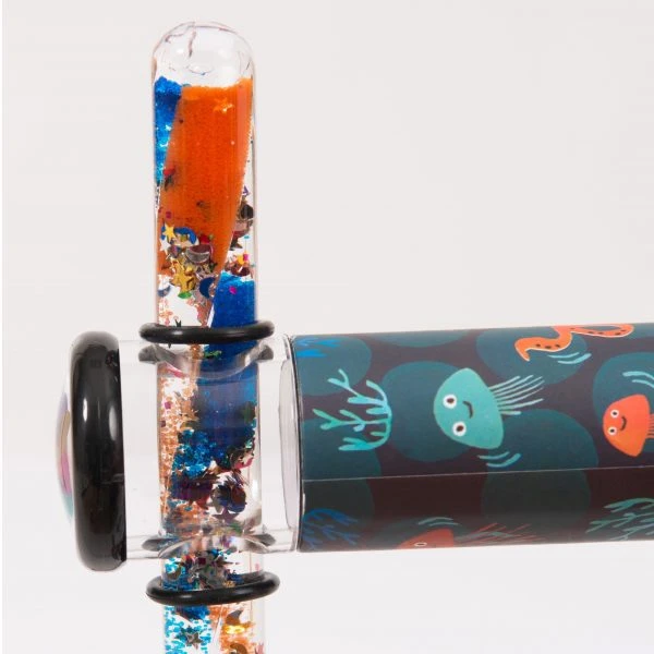 Illustrated kaleidoscope with octopuses. The slide tube contains multi-colored sparkling gel, glitter and sequins that, combined with the small mirrors of the kaleidoscope, create an infinite number of shapes and colors. A toy that will appeal to young and old!