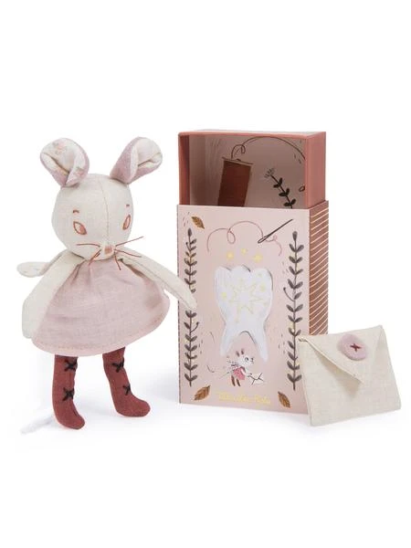The little fairy mouse holds a hook and loop envelope with a flowery design inside, perfect for keeping children’s baby teeth! She is wearing a linen dress with wings at the back, and features an embroidered face and super soft velvet ears. Material: Cotton, Polyester, Linen Dimensions: 17cm Care:Machine washable at 30°C on wool cycle. No tumble dry. Suitable for children from age 3 years+.