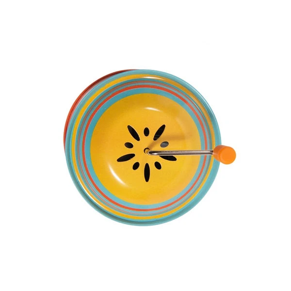 Al girar la manivela suena la música. Modelo con dibujos de cocodrilo y rana. Medidas: 7,50 x 11 cm Edad recomendada: +2 años Material: metal
