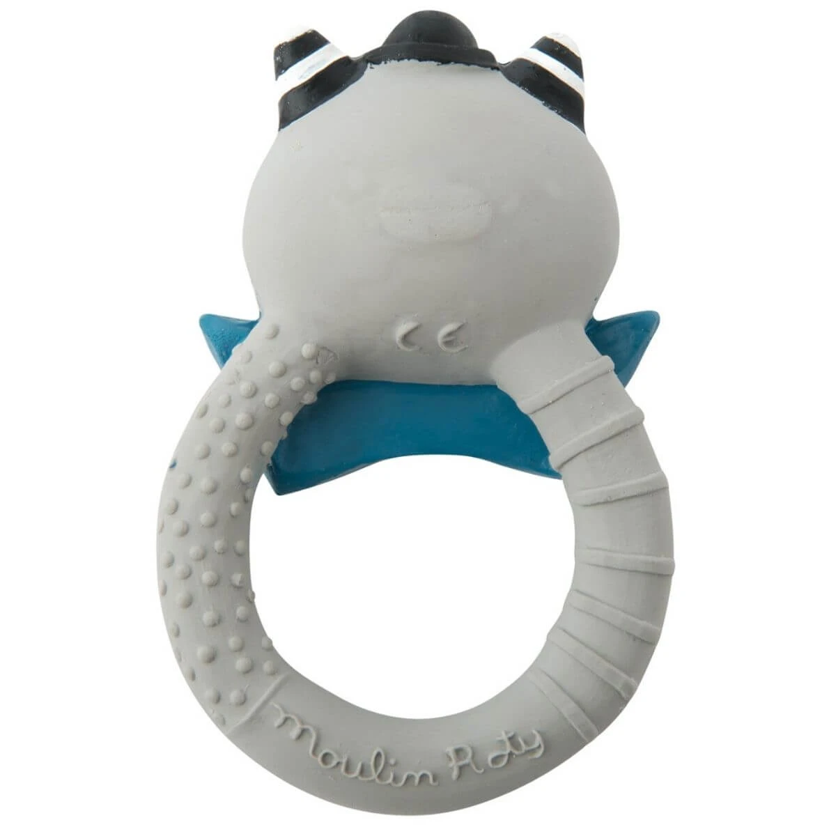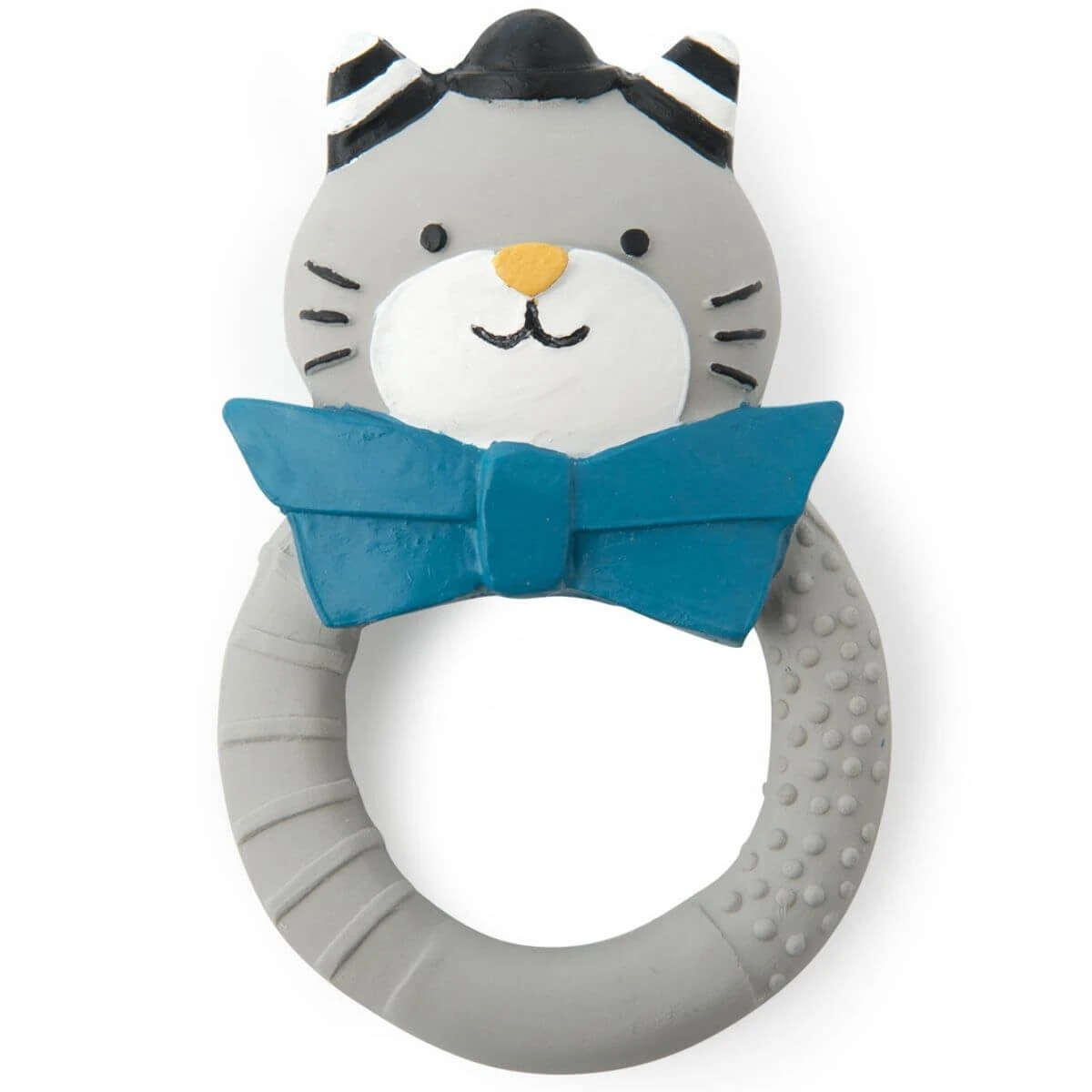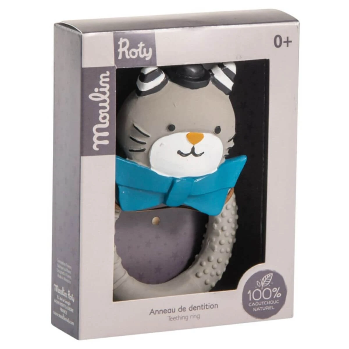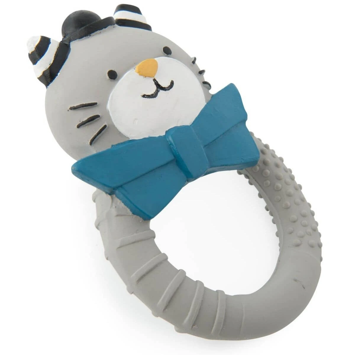 Este mordedor con la carita de un gato gris está hecho de caucho 100% natural y tiene forma de anilla para que tu bebé lo pueda sujetar fácilmente. Ideal para la estimulación sensorial y para calmar las molestias del proceso de dentición.