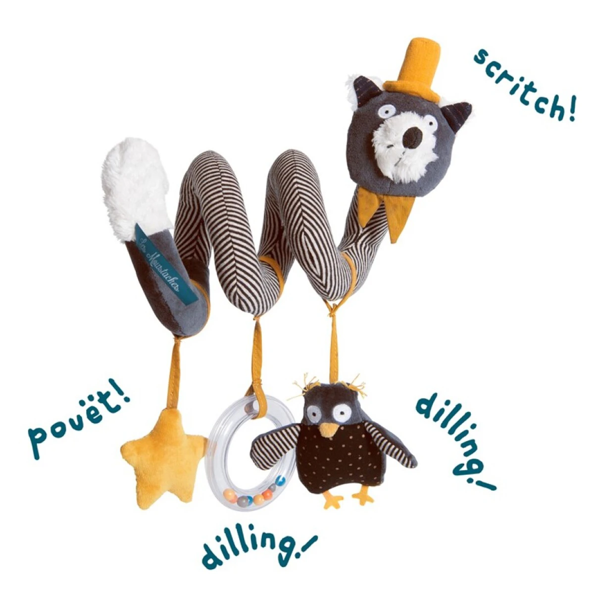 With this spiral of activities you will awaken your baby’s 5 senses. It consists of a ball ring, a star horn and a small owl with a bell. Hang it on the cart or crib and let it experiment. You will love it.