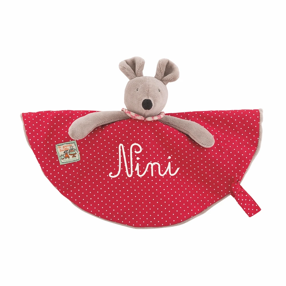Supersoft grey velour plush Nini Mouse comforter from Moulin Roty, with a red and white polka dot blanket ‘skirt’ and a velcro strap. Measuring 24x24cm, the comforter is machine washable on a delicate cycle. Suitable for all ages from newborn.