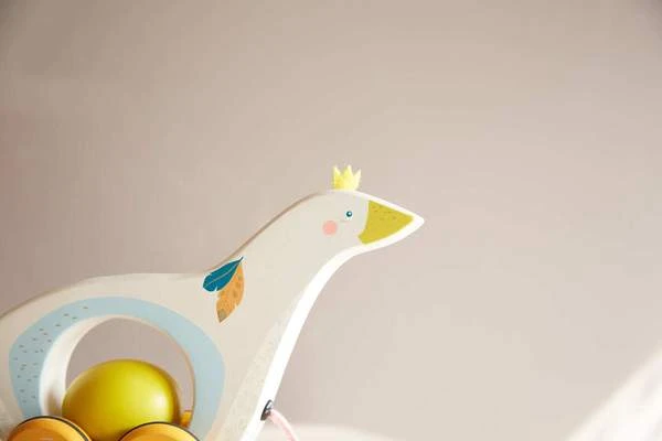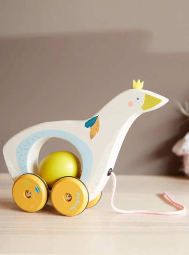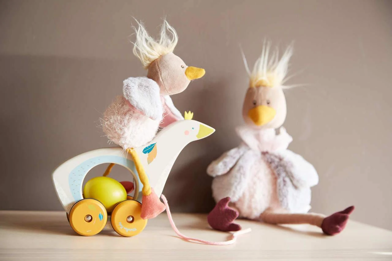 This adorable wooden pull goose and egg toy by French brand Moulin Roty will encourage baby to walk while having fun. By pulling the cord, Olga the goose will join in the walk around the house. To add more fun, the goose carries a wooden egg that moves when baby pulls the cord. Wooden pull along toys promote good balance and coordination in arms and legs. This wooden pull along toddler toy makes the perfect gift for a first birthday or christening. Dimensions: 21 x 7 x 19,5 cm. Material(s): Wood, MDF. Care instructions: Suitable from 10 months. The Brand Moulin Roty, a recognised brand in the children’s toy and Childrens interior and nursery segment, has been creating comforters, toys, world of gentleness and colour for little ones for 45 years. Their pieces are full of charm and personality, not to mention great quality that will stay with your children for years.