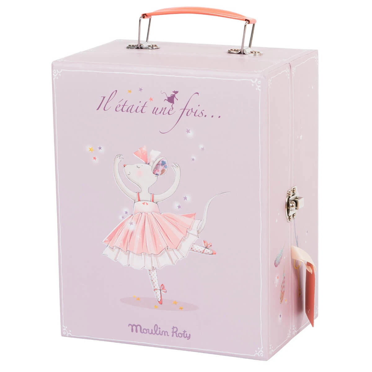 This briefcase contains a sweet little fabric mouse with 3 beautiful shiny tutus. The briefcase carries a mirror and a coat rack for the tutus. Your little one will love taking it everywhere and playing with it non-stop. Material: Textile and cardboard.