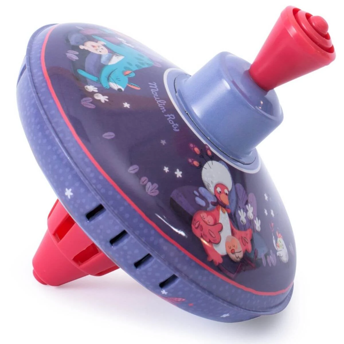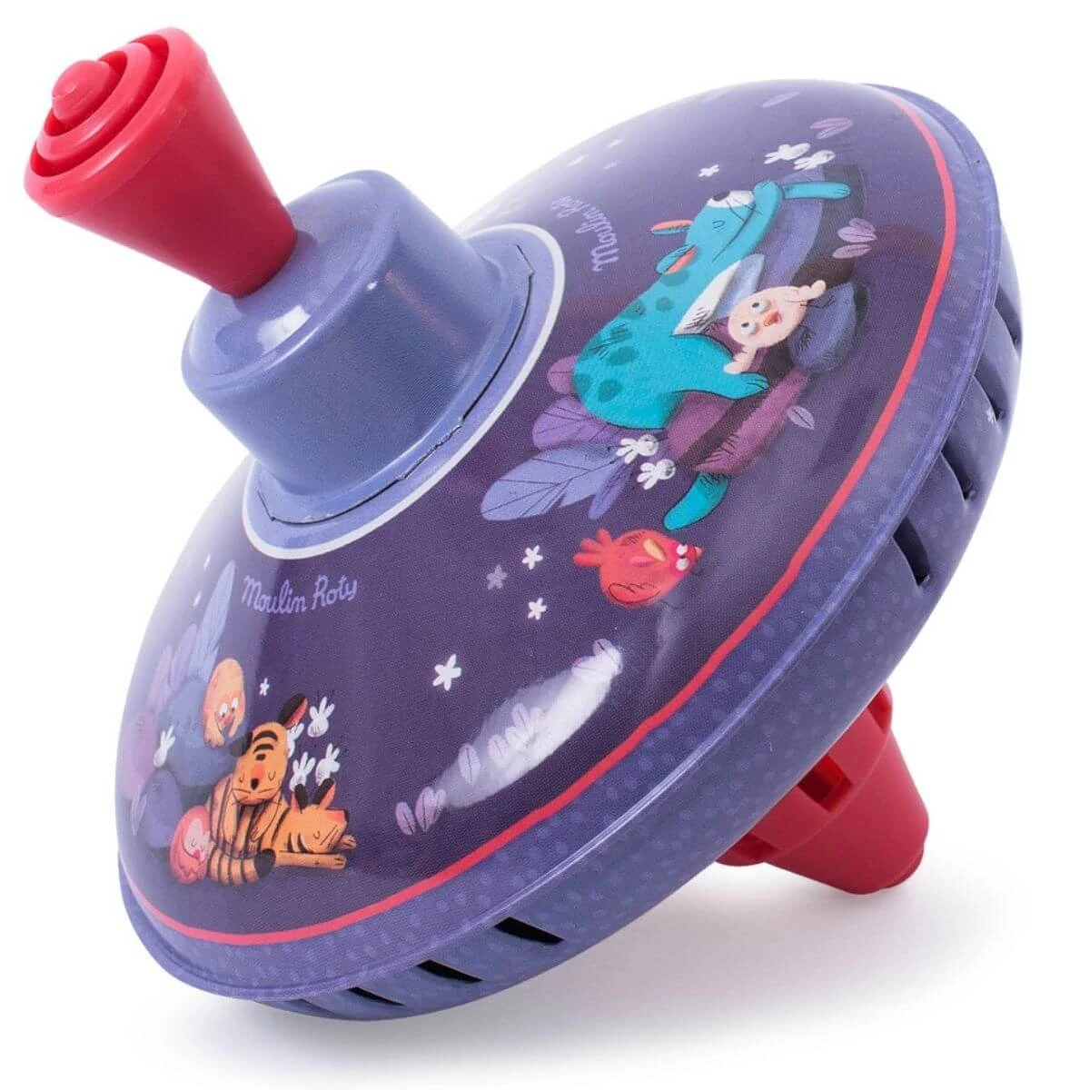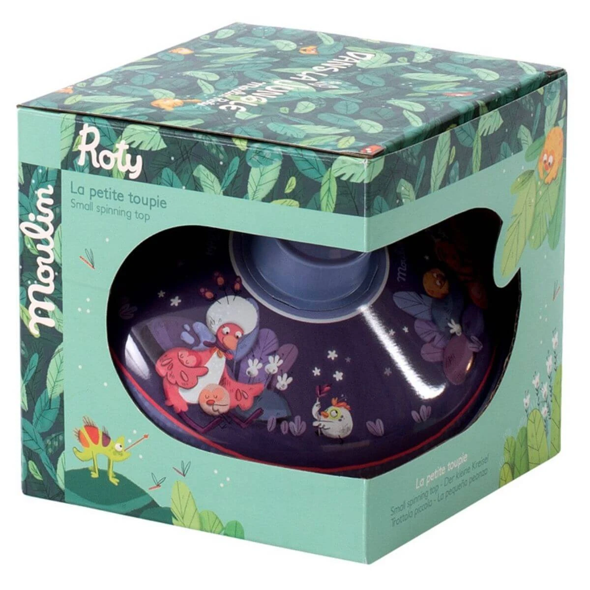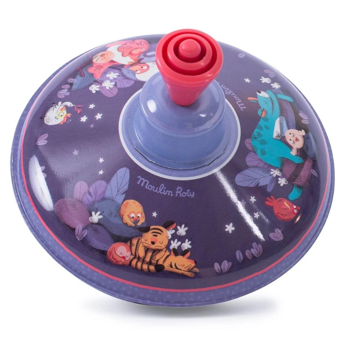 Los clásicos nunca pasan de moda y por eso a tu peque le encantará ver cómo gira una y otra vez esta peonza de metal ilustrada con los animalitos de la colección “En la jungla” de Moulin Roty. Para hacer girar la peonza hay que estirar varias veces la manivela situada en la parte superior antes de lanzarla.
