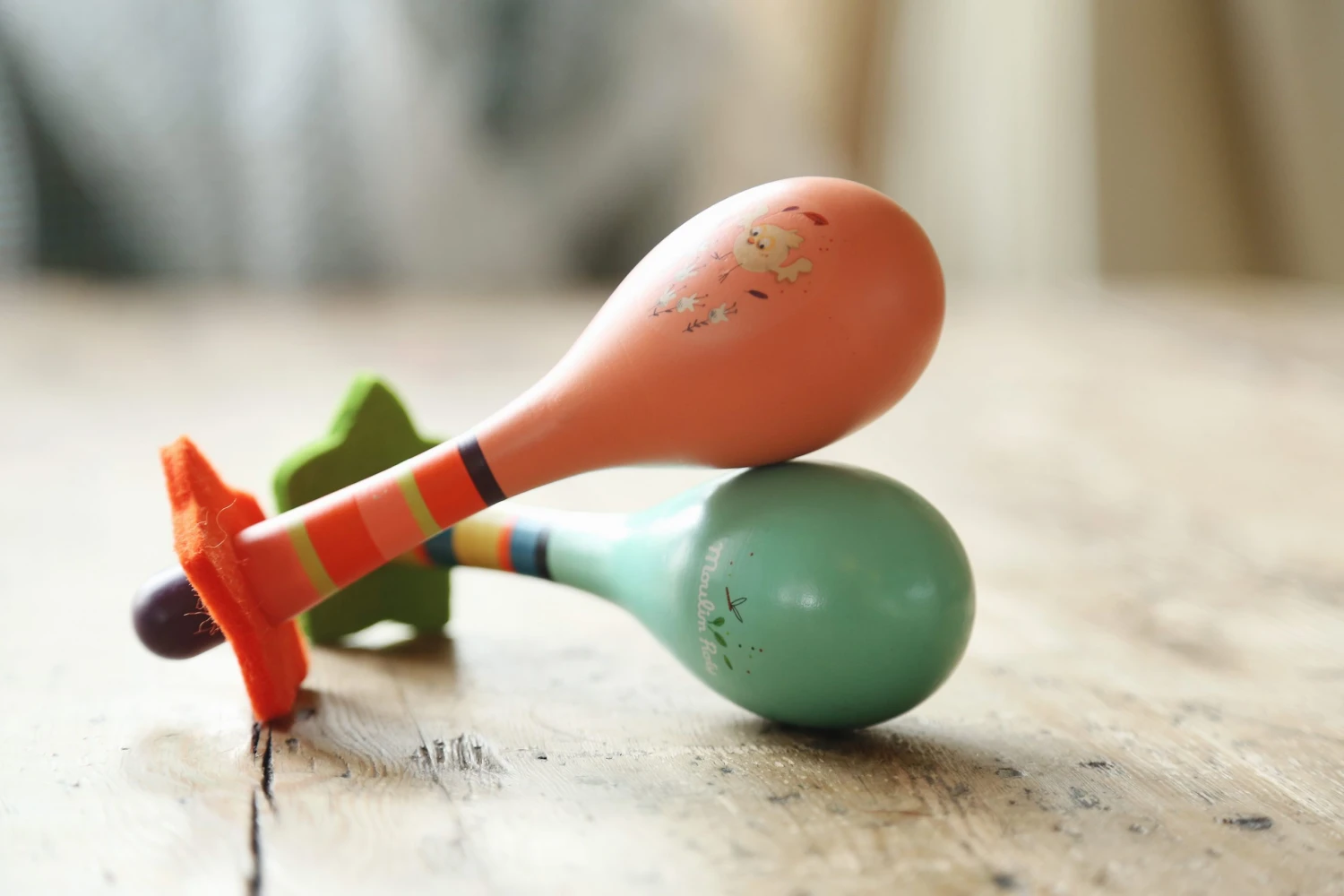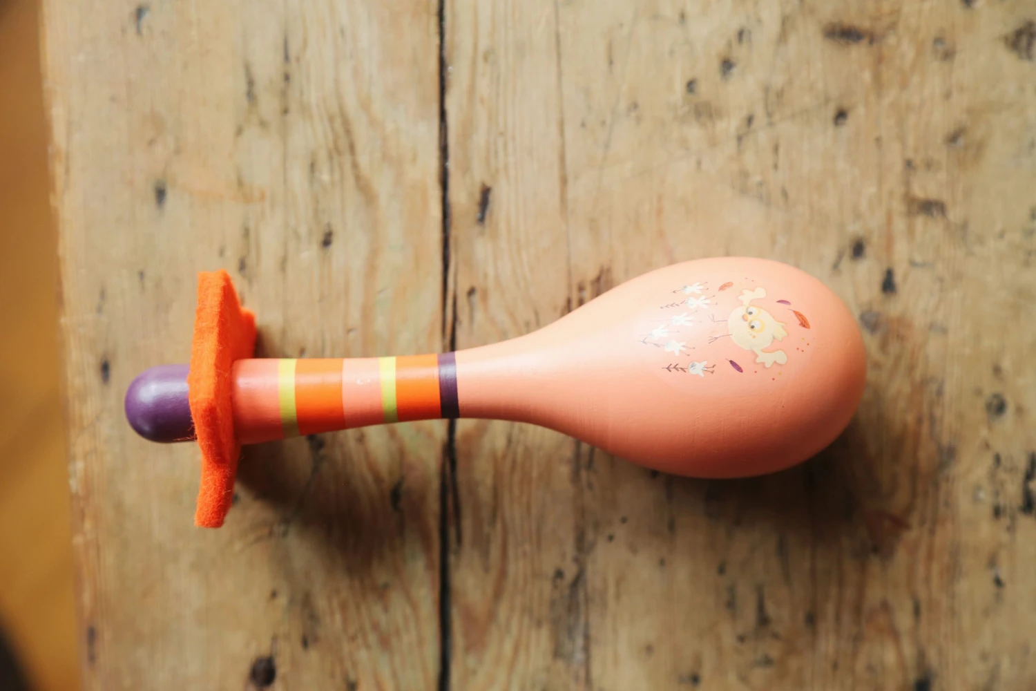 A beautifully illustrated wooden maraca in pink with a cheeky chick illustration and a soft, felt star at the bottom, by the makers at Moulin Roty. The maraca makes a delicate rattle noise that little ones will love and find soothing. It can also be collected alongside our other rattles to make a perfect set.
