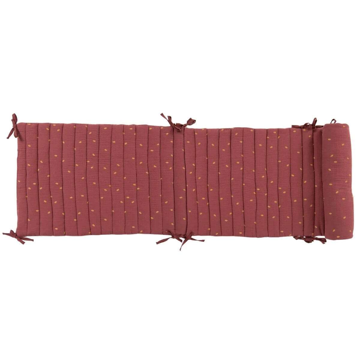 Suave protector de cuna de color terracota con estampado de la colección Después de la Lluvia de Moulin Roty. Para proteger a tu bebé mientras se mueve dormido y se desplaza por la cuna. De algodón orgánico certificado GOTS y OEKO-TEX®, por lo que no contiene materiales tóxicos ni para el medio ambiente ni para la piel de tu bebé. Se sujeta mediante lazos y se adapta a cunas de 60/120 cm o de 70/140 cm. A partir de 0 meses.