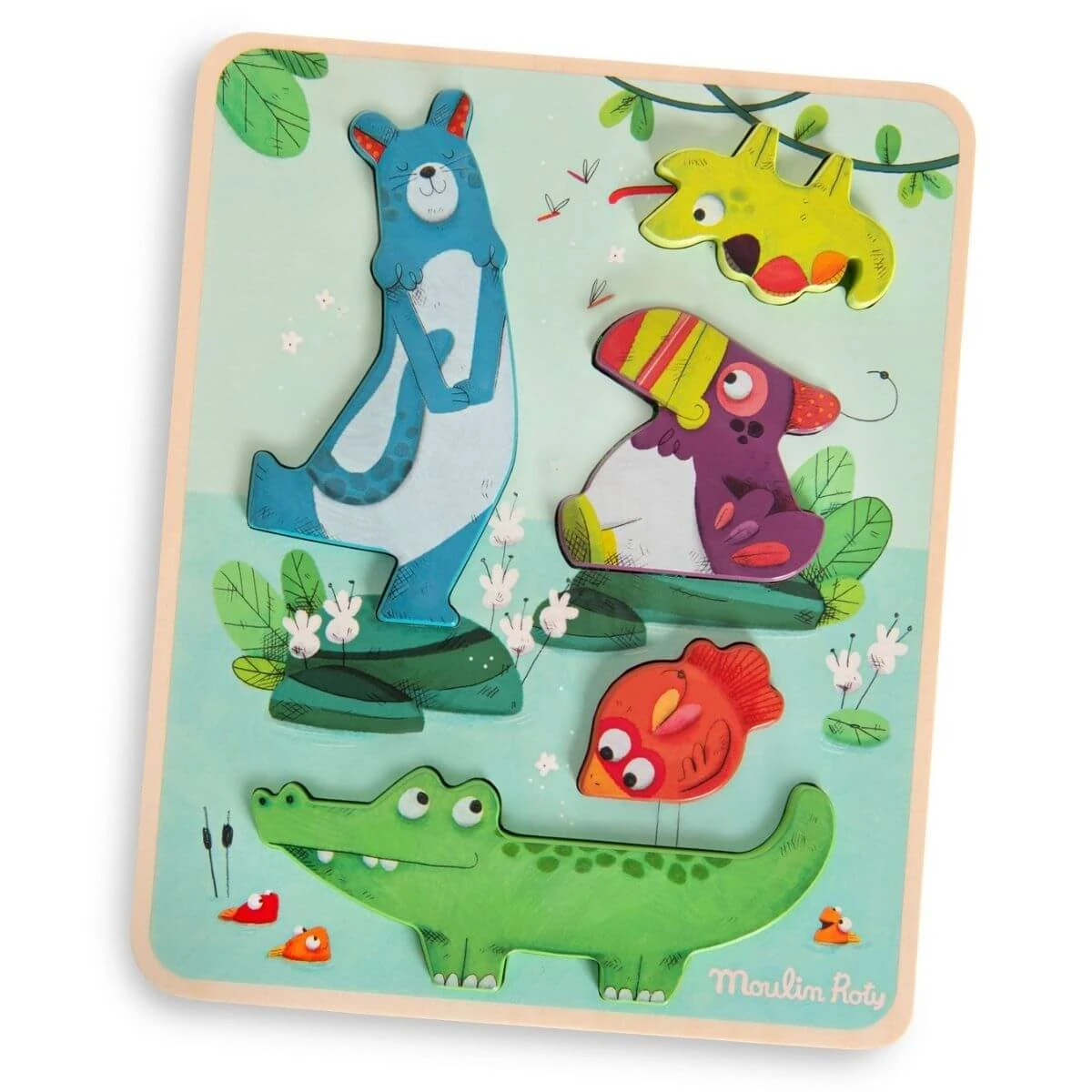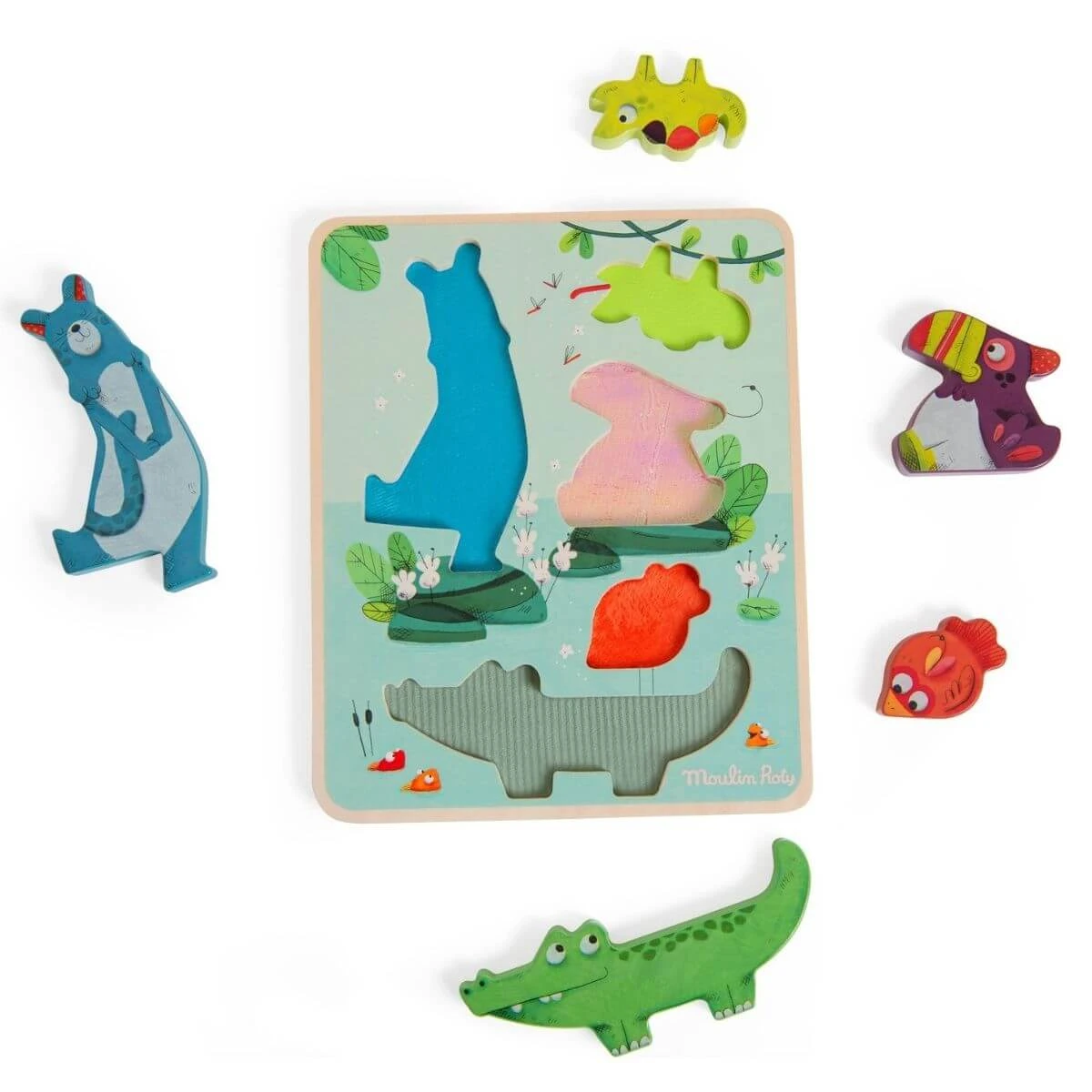 Encaja cada uno de los personajes de la Jungla de Moulin Roty en su espacio correspondiente y explora las distintas texturas que se esconden en el tablero del puzzle. También puedes jugar con las distintas piezas y apilarlas en equilibrio. Ideal para desarrollar la concentración, la coordinación ojo – mano y la motricidad fina.