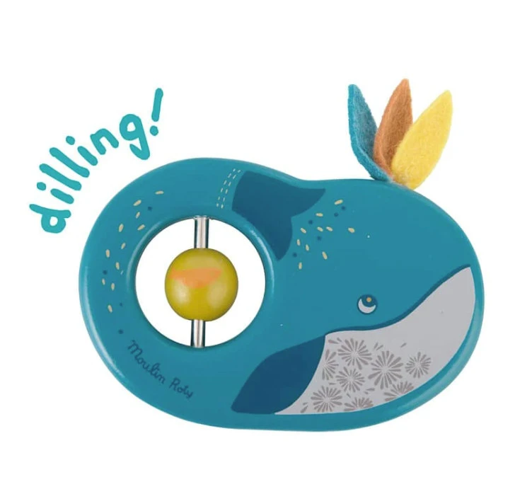 Joséphine, la balena blu in legno della collezione Le Voyage d’Olga di Moulin Roty. Il gioco ha una perlina gialla al centro, illustrata con un pesce, da far scorrere lungo un’asta di metallo. Il gioco suscita curiosità e sviluppa la capacità motoria del bambino – un giocattolo che serve per l’apprendimento, che gli permetterà di scoprire nuove sensazioni, colori e un piacere sensoriale mentre il bambino gioca e mordicchia questo adorabile sonaglio. Lunghezza: 11 cm / Materiale: Legno Dai 10 mesi.