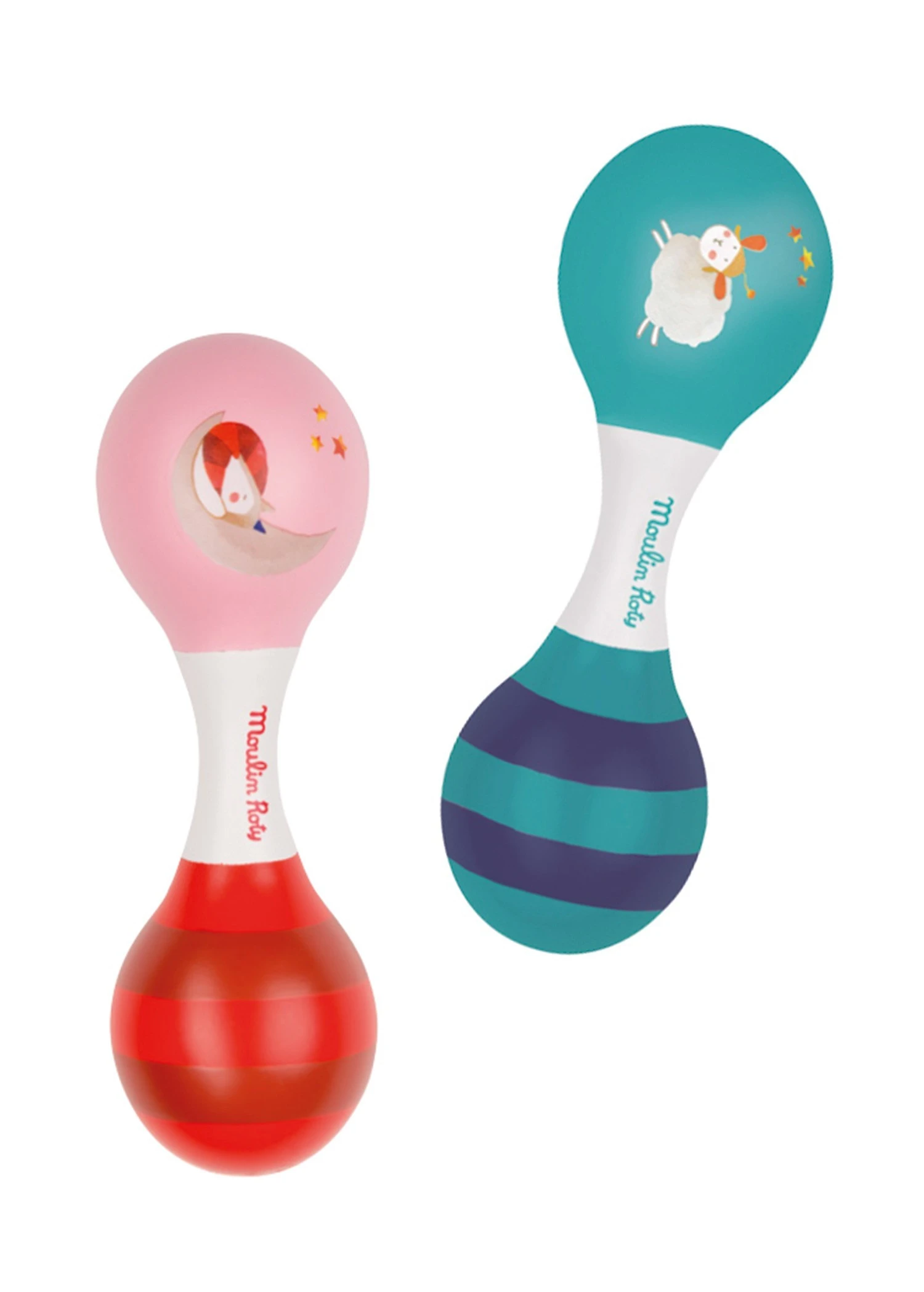 Queste maracas in legno di colore bianco raffigura le illustrazioni popolari basate sul tema del viaggio rappresentato da piccoli pesci, piume e ciondoli. Questo giocattolo sviluppa il ritmo e le abilità motorie.