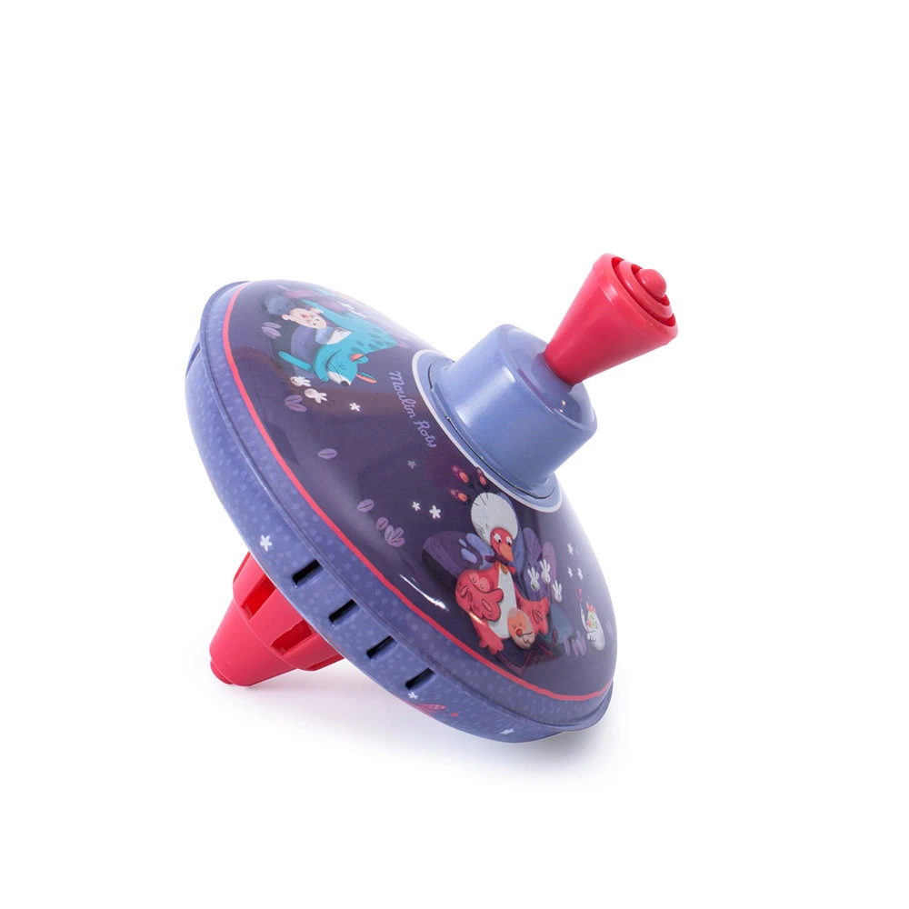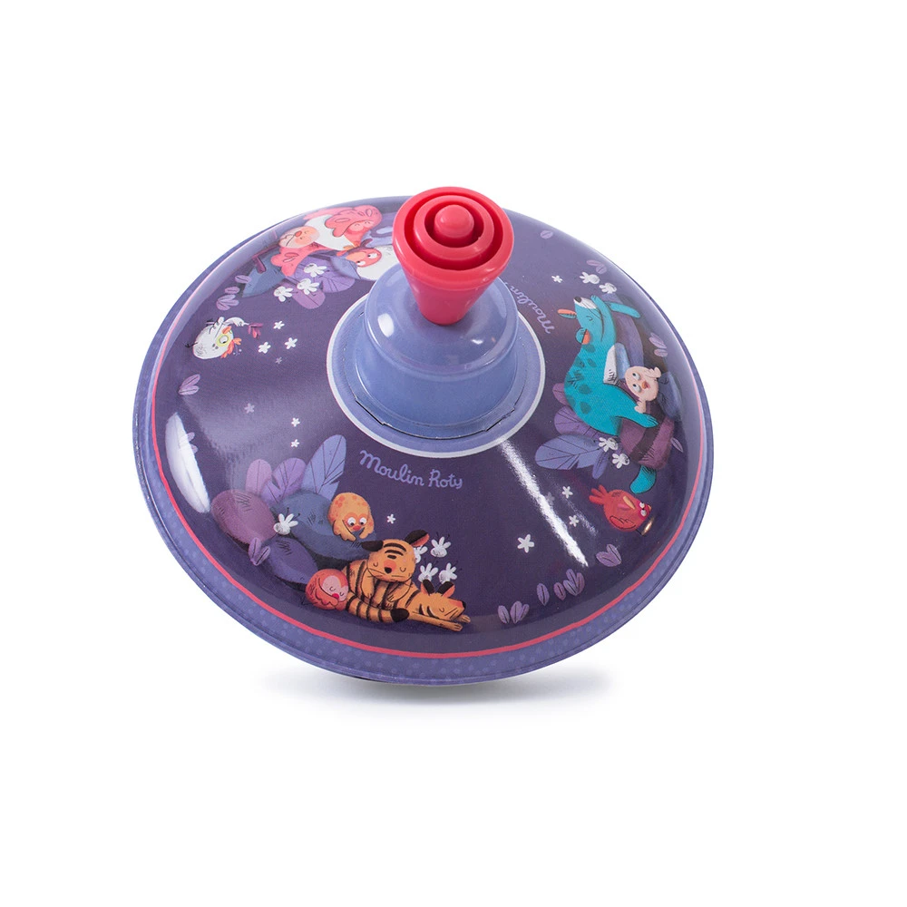 Piccola trottola in metallo dallo stile vintage: gira e fischia! Questa piccola trottola in metallo è illustrata con immagini in stile cartone animato sul tema degli animali nella giungla! Zimba la pantera blu sta dormendo e l’uccello Paloma sta giocando! Facilmente impugnabile, il suo movimento affascinerà i più piccoli che eserciteranno le loro capacità motorie facendolo ruotare. Aziona la trottola, falla girare più forte che puoi e senti il suono che emette. Presentato in una scatola di cartone illustrata. Dimensioni: 11,5 x 11,5 cm Da 2 anni.